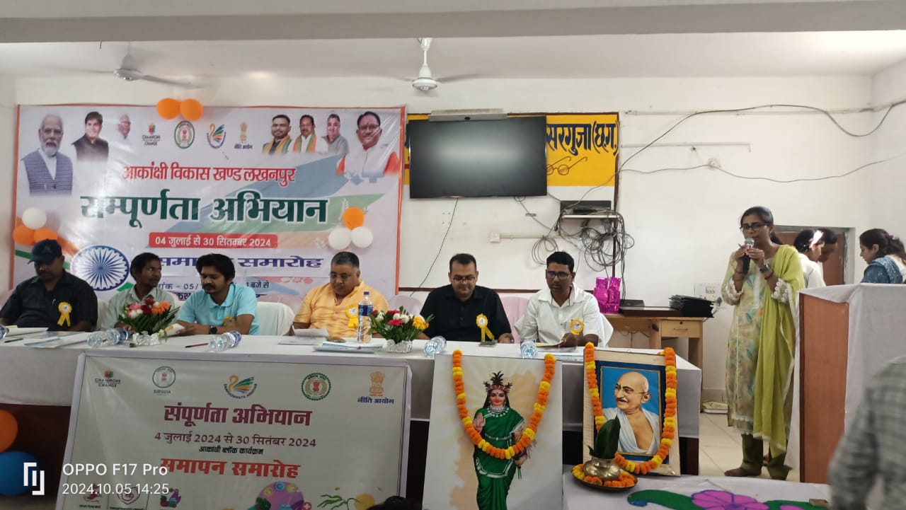 लखनपुर / दिनेश बारी, 05/10/2024 नीति आयोग के निर्देशानुसार छत्तीसगढ़ के सरगुजा जिले के आकांक्षी विकासखंड लखनपुर में 4 जुलाई से 30 सितंबर 2024 तक संपूर्णता अभियान चलाया गया था। इसका समापन कार्यक्रम 5 अक्टूबर, शनिवार को लखनपुर जनपद कार्यालय में संपन्न हुआ। इस अवसर पर अंबिकापुर विधायक राजेश अग्रवाल, भाजपा मंडल अध्यक्ष दिनेश साहू, लुण्ड्रा विधायक प्रतिनिधि राकेश साहू, नगर पंचायत उपाध्यक्ष रामनारायण दुबे सहित कई प्रशासनिक अधिकारी उपस्थित रहे। कार्यक्रम की शुरुआत स्वागत गीत से की गई और अतिथियों ने राष्ट्रपिता महात्मा गांधी, माता सरस्वती और छत्तीसगढ़ महतारी के चित्रों के समक्ष माल्यार्पण कर दीप प्रज्वलित किया। इसके बाद अतिथियों को पुष्प गुच्छ भेंट कर स्वागत किया गया। समापन कार्यक्रम में आकांक्षा ब्रांड ‘वोकल फॉर लोकल’ के तहत विभिन्न प्रकार के स्टॉल लगाए गए थे। विधायक राजेश अग्रवाल और अन्य अतिथियों ने स्टॉल का निरीक्षण करते हुए महिला समूहों द्वारा किए गए कार्यों की प्रशंसा की। विधायक राजेश अग्रवाल ने ‘वोकल फॉर लोकल’ के अंतर्गत स्थानीय उत्पादों को बढ़ावा देने के लिए नगर पंचायत कार्यालय को एक दुकान आवंटित करने के निर्देश दिए। साथ ही, आकांक्षी विकासखंड लखनपुर में विभिन्न विभागों के शत-प्रतिशत कार्यों की सराहना करते हुए एनआरएलएम की महिला समूह, आंगनवाड़ी कार्यकर्ताओं, स्वास्थ्य विभाग, कृषि विभाग और महिला एवं बाल विकास विभाग के अधिकारियों को पुरस्कृत कर सम्मानित किया गया। प्रधानमंत्री आवास योजना के प्रमाण पत्र भी अतिथियों द्वारा प्रदान किए गए। अपने संबोधन में विधायक राजेश अग्रवाल ने सरकार द्वारा जनहित में किए जा रहे कार्यों पर प्रकाश डाला। इस दौरान जिला पंचायत सीईओ नूतन कुमार कंवर, अपर कलेक्टर सुनील नायक, मुख्य कार्यकारी अधिकारी वेद प्रकाश पांडे, एसडीओ दिलीप कुमार मिंज, कार्यक्रम अधिकारी अभिषेक मिंज, शोभिता शुक्ला, सचिव संघ प्रदेश अध्यक्ष उपेंद्र सिंह, अनिल गुप्ता, जयपाल साहू सहित कई विभागों के अधिकारी और कर्मचारी उपस्थित रहे। Post Views: 313 Please Share With Your Friends Also Post navigation रेण नदी से रेत के अवैध खनन और परिवहन पर राजस्व और पुलिस की संयुक्त कार्रवाई: एनजीटी नियमों की धज्जियां उड़ाते रेत माफिया पैगंबर मोहम्मद के खिलाफ टिप्पणी पर यति नरसिंहानंद के खिलाफ कार्रवाई की मांग: अंजुमन गौसिया कमेटी ने लखनपुर थाना प्रभारी को सौंपा ज्ञापन