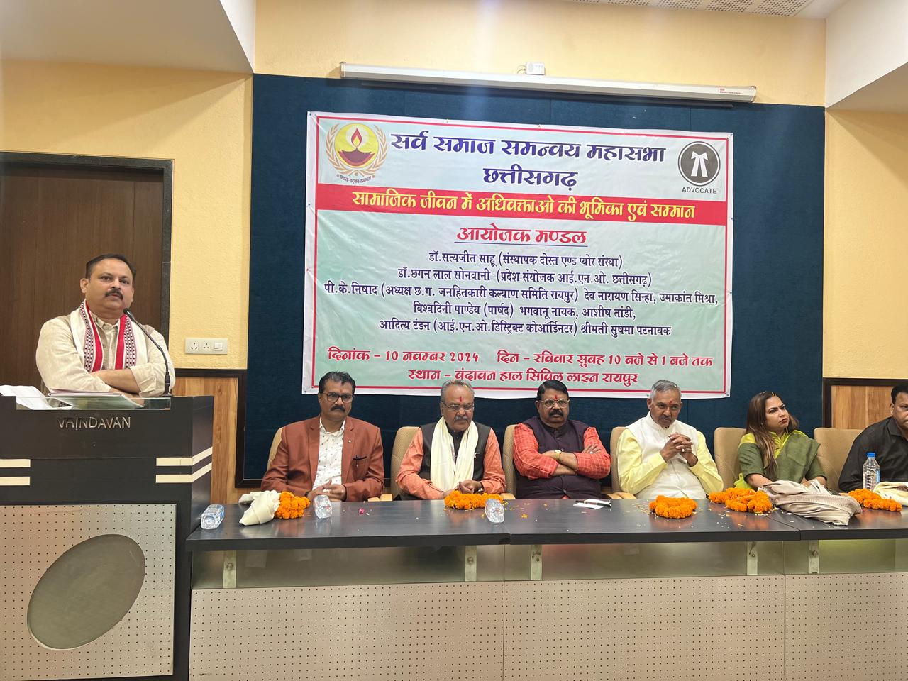 डॉ सत्यजीत साहू / रायपुर सर्व समाज समन्वय महासभा ने ‘सामाजिक जीवन में अधिवक्ताओं की भूमिका’ पर किया विशेष कार्यक्रम का आयोजन रायपुर, छत्तीसगढ़, 10 नवंबर 2024। समाज में न्यायिक व्यवस्था को सुदृढ़ करने और न्याय के प्रति लोगों की आस्था को मजबूत करने में अधिवक्ताओं की भूमिका अत्यंत महत्वपूर्ण होती है। इसी भावना को सम्मानित करने के उद्देश्य से छत्तीसगढ़ की सामाजिक संस्था सर्व समाज समन्वय महासभा द्वारा आज राजधानी रायपुर के सिविल लाइन स्थित वृंदावन हॉल में सामाजिक जीवन में अधिवक्ताओं की भूमिका विषय पर एक विशेष कार्यक्रम का आयोजन किया गया। इस कार्यक्रम में कानूनी क्षेत्र में विशेष योगदान देने वाले अधिवक्ताओं को ‘विधि रत्न’ सम्मान प्रदान किया गया। कार्यक्रम के मुख्य अतिथि श्री रूप नारायण सिन्हा, जो भाजपा सहयोग केंद्र प्रभारी हैं, ने अधिवक्ताओं के योगदान को रेखांकित करते हुए कहा, “अधिवक्ता समाज के अभिन्न अंग हैं जो समाज के अंतिम व्यक्ति तक न्याय पहुँचाने का कार्य करते हैं। समाज में उनकी भूमिका अत्यंत महत्वपूर्ण है। बिना अधिवक्ताओं के न्याय प्रणाली का सुचारु संचालन असंभव है।” उन्होंने समाज के प्रति अधिवक्ताओं की जिम्मेदारी को भी रेखांकित किया और कहा कि अधिवक्ता केवल अपने पेशेवर कर्तव्यों तक सीमित नहीं होते, बल्कि समाज को न्याय प्रदान करने में भी महत्वपूर्ण योगदान देते हैं। कार्यक्रम में विशिष्ट अतिथि के रूप में विधि सलाहकार श्रीमती नेहा गुप्ता ने न्यायिक प्रक्रिया को अधिक सुलभ और सहज बनाने की आवश्यकता पर जोर दिया। उन्होंने कहा, “हम सभी को मिलकर इस बात पर कार्य करना चाहिए कि हर व्यक्ति को सुलभ और सरल न्याय मिले। न्यायिक व्यवस्था को सशक्त और मजबूत बनाने के लिए सामूहिक प्रयासों की आवश्यकता है।” सर्व समाज समन्वय महासभा के प्रमुख डॉ. उदयभान सिंह चौहान ने स्वागत भाषण में कहा, “हमारी संस्था समाज के सभी वर्गों को जोड़ने और उनके बीच समन्वय स्थापित करने के उद्देश्य से कार्य कर रही है। अधिवक्ताओं का कार्य समाज में न्याय दिलाने का है, और उनका सम्मान करना हमारा दायित्व है।” कार्यक्रम के मुख्य वक्ता श्री सच्चिदानंद उपासने, जो राष्ट्रीय लोकतंत्र सेनानी संघ के उपाध्यक्ष हैं, ने अधिवक्ताओं के सामाजिक और पारिवारिक जीवन में आने वाली कठिनाइयों का जिक्र किया। उन्होंने कहा, “अधिवक्ताओं का जीवन कठिनाइयों से भरा होता है। वे पीड़ितों को न्याय दिलाने, लोगों की समस्याओं को दूर करने और उन्हें मुसीबतों से बचाने का कार्य करते हैं।” ज़िला अधिवक्ता संघ रायपुर के अध्यक्ष श्री हितेंद्र तिवारी ने इस अवसर पर अपने विचार साझा करते हुए कहा, “अधिवक्ता अपने पक्षकारों के लिए कड़ी मेहनत करता है, और 