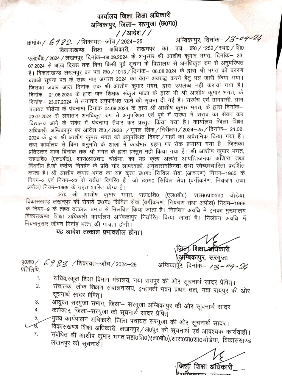 जिला शिक्षा अधिकारी की कार्यवाही से शिक्षकों में हड़कंप लखनपुर/दिनेश बारी 17/09/ 2024 विकासखंड शिक्षा अधिकारी लखनपुर के पत्र क्रमांक 1252 दिनांक 9.9.2024 के अनुसार श्री आशीष कुमार भगत दिनांक 23.07.2024 से लगातार बिना किसी पूर्व सूचना के विद्यालय से अनधिकृत रूप से अनुपस्थित थे जिसके कारण विकासखंड शिक्षा अधिकारी लखनपुर के द्वारा श्री आशीष कुमार भगत को कारण बताओ सूचना पत्र जारी करते हुए अगस्त 2024 का वेतन रोकने की कार्रवाई की गई जिसका जवाब आज दिनांक तक श्री आशीष कुमार भगत द्वारा उपलब्ध नहीं कराया गया। दिनांक 21.8 2024 को जन शिक्षक संकुल केंद्र मांगा के द्वारा श्री आशीष कुमार भगत के दिनांक 23 .07.2024 से लगातार अनुपस्थित रहने की सूचना दी गई सरपंच एवं ग्राम वासी ग्राम पंचायत चोडेया के पंचनामा दिनांक 04.09. 2024 के द्वारा आशीष कुमार भगत के द्वारा दिनांक 23 जुलाई से लगातार अनुपस्थित एवं पूर्व में विद्यालय में शराब का सेवन कर आने के संबंध में पंचनामा तैयार कर प्रस्तुत किया गया था श्री आशीष कुमार भगत सहायक शिक्षक एल बी का यह कृत्य अत्यंत आपत्तिजनक अशिष्ट तथा निंदनीय है जो कर्तव्य के प्रति घोर लापरवाही अनुशासनहीनता तथा स्वेक्षाचारिता को प्रदर्शित करता है जिला शिक्षा अधिकारी अंबिकापुर के आदेश क्रमांक 6982 दिनांक 13.9.2024 के द्वारा श्री आशीष कुमार भगत को छत्तीसगढ़ सिविल सेवा आचरण नियम 1965 के नियम तीन एवं नियम 23 से सर्वथा विपरीत होने के कारण तत्काल प्रभाव से निलंबित किया गया है तथा निलंबन अवधि में मुख्यालय विकासखंड शिक्षा अधिकारी कार्यालय अंबिकापुर निर्धारित किया गया है निलंबन अवधि में नियमानुसार जीवन निर्वाह भत्ता की पात्रता होगी। उसी तारतम्य में विकास खंड शिक्षा अधिकारी लखनपुर का पत्र क्रमांक 1248 दिनांक 9.9 2024 के अनुसार श्री विनोद कुमार सिंह प्रधान पाठक प्राथमिक शाला पंडरीपानी दिनांक 6. 7.24 से आज दिनांक तक बिना किसी पूर्व सूचना के विद्यालय से अनधिकृत रूप से अनुपस्थित हैं विकासखंड शिक्षा अधिकारी लखनपुर के द्वारा दिनांक 11.07. 2024 को कारण बताओ सूचना पत्र जारी किया गया है जिसका जवाब आज दिनांक तक अप्राप्त है दिनांक 30 .07. 2024 के द्वारा अनुपस्थित के एवज में श्री विनोद कुमार सिंह का जुलाई 2024 का वेतन रोका गया प्रभारी प्रधान पाठक प्राथमिक शाला पंडरी पानी के द्वारा श्री विनोद कुमार सिंह के अनुपस्थिति की जानकारी पुनः विकासखंड लखनपुर में दिनांक 4.9.24 को दी गई श्री विनोद कुमार सिंह प्रधान पाठक शासकीय प्राथमिक शाला पंडरीपानी का यह कृत्य अत्यंत आपत्तिजनक अशिष्ट तथा नंदिनी है जो कर्तव्य निर्माण के प्रति और लापरवाही अनुशासन अंतर तथा शिक्षा चरित्र को प्रदर्शित करता है श्री विनोद कुमार सिंह का यह कृत्य छत्तीसगढ़ सिविल सेवा आचरण एवं 1965 के नियम ती