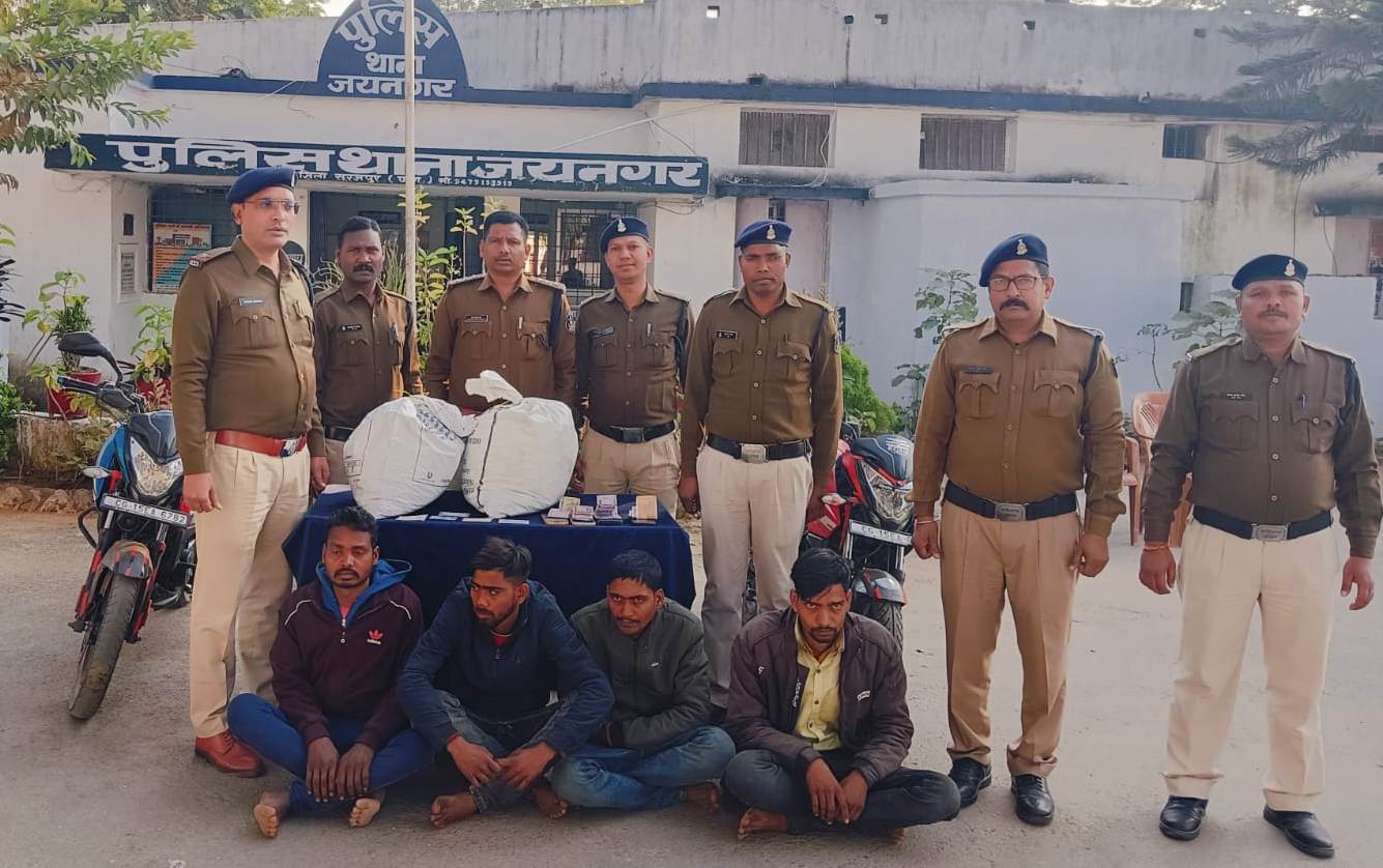 पप्पू जायसवाल सूरजपुर की रिपोर्ट सूरजपुर। वरिष्ठ पुलिस अधीक्षक श्री प्रशांत कुमार ठाकुर के कड़े निर्देश के बाद से ही थाना-चौकी की पुलिस के द्वारा अवैध कार्यो में लिप्त लोगों की लगातार धरपकड़ का अभियान जारी है। एनएच पर वाहन चेकिंग के दौरान थाना जयनगर पुलिस ने 2 मोटर सायकल सहित 4 लोगों से 3 लाख रूपये कीमत के 12 किलो गांजा जप्त करने में सफलता हासिल की है। दिनांक 17/12/2024 को थाना जयनगर पुलिस थाना के सामने एनएच पर वाहनों की चेकिंग में लगी हुई थी इस दौरान दो मोटर सायकल में वाहन चालक एवं सवार व्यक्तियों की चेकिंग कार्यवाही के दौरान रोककर पूछताछ करने पर उनकी गतिविधियां संदिग्ध होने पर दोनों मोटर सायकल चालक व बैठे व्यक्ति की विधिवत् तलाशी ली गई। एक मोटर सायकल में झोला पकड़े व्यक्ति महेन्द्र सिंह व बैग पकड़े व्यक्ति रामायण जायसवाल दोनों के कब्जे से 6 किलो गांजा तथा दूसरे मोटर सायकल में मंजेश जायसवाल व पीछे बैठे व्यक्ति महेन्द्र जायसवाल दोनों के कब्जे से 6 किलो गांजा कुल 12 किलो मादक पदार्थ गांजा जप्त किया गया जिसकी बाजारू कीमत करीब 3 लाख रूपये है। मामले में अवैध गांजा व परिवहन में प्रयुक्त 2 मोटर सायकल जप्त कर धारा 20बी, 29 एनडीपीएस एक्ट के तहत कार्यवाही कर चारों आरोपियों को गिरफ्तार किया गया है। इस कार्यवाही में थाना प्रभारी जयनगर नरेन्द्र सिंह, एएसआई रघुवंश सिंह, विशाल मिश्रा, प्रधान आरक्षक राजेन्द्रर सिंह, मुकेश्वर वर्मा, आरक्षक विकास मिश्रा, सोनू सिंह, राजीव गवेल, अविनाश कुजूर, भुनेश्वर सिंह, मिलन सिंह, सुरेश तिवारी व नीरज सिंह सक्रिय रहे। गिरफ्तार आरोपी:- (1) महेन्द्र सिंह पिता ज्वाहिर सिंह उम्र 28 वर्ष (2) मंजेश जायसवाल पिता रामसुभग जायसवाल उम्र 28 वर्ष (3) रामायण जायसवाल पिता रामरतन जायसवाल उम्र 20 वर्ष (4) महेन्द्र जायसवाल पिता स्व. रामकृपाल जायसवाल उम्र 32 वर्ष निवासी ग्राम अवन्तिकापुर, थाना चांदनी जिला सूरजपुर (छ.ग.) Post Views: 423 Please Share With Your Friends Also Post navigation एसएसपी सूरजपुर ने शहीद परिवार के सदस्यों को साल-श्रीफल व स्मृति चिन्ह भेंट कर किया सम्मानित। वार्षिक खेलकूद प्रतियोगिता: वियन्नी इंग्लिश मीडियम स्कूल झिरमिटी में उत्साह का माहौल, मुख्य अतिथि ने विजेताओं को मेडल व ट्रॉफी प्रदान की