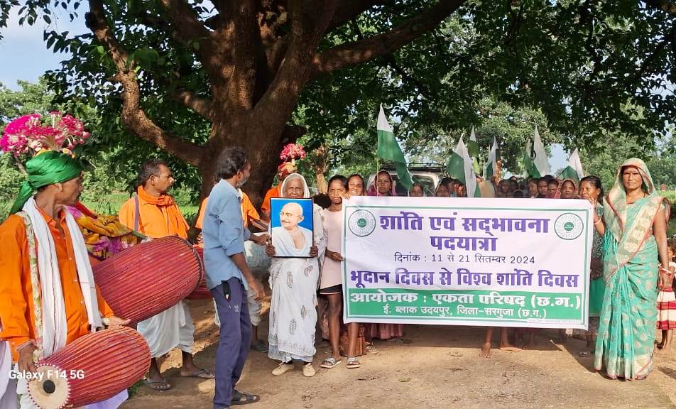 11 से 21 सितम्बर 2024 भूदान दिवस से विश्व शांति दिवस तक पदयात्रा एवं शांति सभा छत्तीसगढ के जिला सरगुजा ब्लॉक उदयपुर में आयोजित किया गया इसी कड़ी में एकता परिषद के तत्वाधान में पदयात्रा मृगाडांड से उदयपुर तक आयोजित किया गया, शांति सभा का संचालन रघुवीर दास एकता परिषद राज्य समन्वयक उत्तर छत्तीसगढ़ ने किया कार्यक्रम के शुरुआत में जिला पंचायत सदस्य राजनाथ सिंह उदयपुर, आशाराम ललाती सरपंच, सिद्धार्थ सिंह देव पूर्व विधायक प्रतिनिधि, ओमप्रकाश सिंह जनपद पंचायत उदयपुर के अध्यक्ष प्रतिनिधि एवं संगठन के मुखिया श्रीमति मानमति, श्रीमति मीना , श्रीमति रतियानो , श्रीमति रजनी देवी ,व प्रमिला तिग्गा आदि के द्वारा गांधी जी के छाया चित्र में पूजा अर्चना माल्यार्पण एवं दीप प्रज्ज्वलित कर किया गया। उसके पश्चात प्रमिला केरकेट्टा एवं अमरनाथ फुलसुंदरी के द्वारा सर्व धर्म प्रार्थना करवाए एवं जय जगत का गीत भी गाया गया।