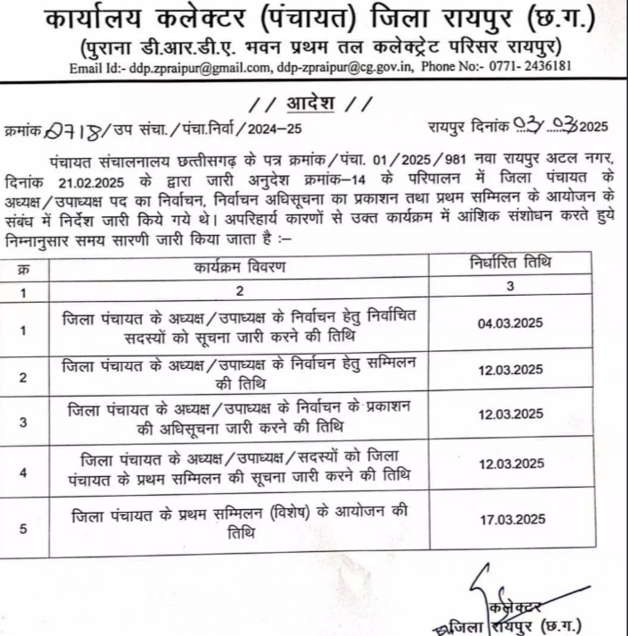 रायपुर। जिला पंचायत अध्यक्ष और उपाध्यक्ष चुनाव के तारीख में बदलाव किया गया है। अब 12 मार्च को निर्वाचन और 17 मार्च को प्रथम सम्मेलन होगा। वहीं चुनाव के तारीख में बदलाव का कारण बताया कि पंचायत संचालनालय छत्तीसगढ़ के पत्र क्रमांक / पंचा. 01/2025 / 981 नवा रायपुर अटल नगर, दिनांक 21.02.2025 के द्वारा जारी अनुदेश क्रमांक – 14 के परिपालन में जिला पंचायत के अध्यक्ष / उपाध्यक्ष पद का निर्वाचन, निर्वाचन अधिसूचना का प्रकाशन तथा प्रथम सम्मिलन के आयोजन के संबंध में निर्देश जारी किये गये थे। अपरिहार्य कारणों से उक्त कार्यक्रम में आंशिक संशोधन करते हुये निम्नानुसार समय सारणी जारी किया जाता है। Post Views: 421 Please Share With Your Friends Also Post navigation CG बजट : 3200 पदों पर जवानों की भर्ती, खतरनाक अपराधियों से निपटने NSG की तर्ज पर बनेगी SOG लूट की घटना से दहशत: पेट्रोल पंप संचालक से 76 हजार लूट..