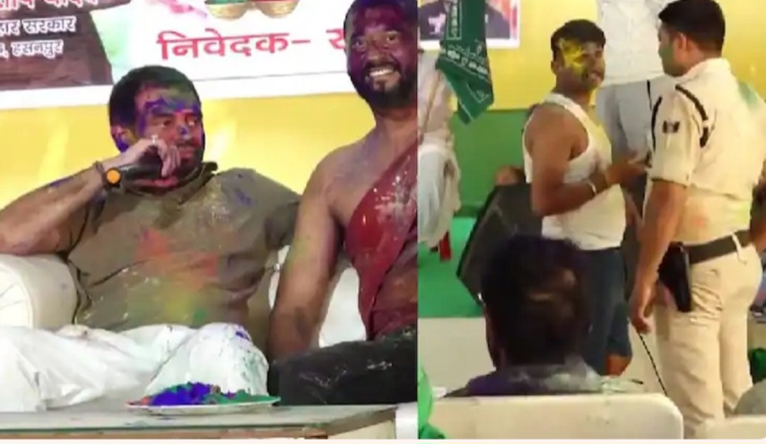 पटना. बिहार में आज शनिवार (15 मार्च) को भी कई इलाकों में हर्षोल्लास के साथ होली का त्योहार मनाया गया . सियासी गलियारों में भी होली का खुमार छाया है. आरजेडी सुप्रीमो लालू प्रसाद यादव के बड़े बेटे तेज प्रताप यादव ने भी शनिवार (15 मार्च) को होली मनाई. इस मौके पर उनके सरकारी आवास पर उनके चाहने वाले और कार्यकर्ता मौजूद रहे. तेज प्रताप यादव ने खेली कुर्ता फाड़ होलीइस मौके पर तेज प्रताप यादव ने होली के गीत गाए और कुर्ता फाड़ होली खेलते हुए नजर आ रहे हैं. तेज प्रताप यादव ने कई कार्यकर्ताओं के कुर्ते भी फाड़ा और लगातार रंग अबीर से कार्यकर्ताओं को सराबोर करते नजर आए. इस दौरान उन्होंने बिहार वासियों को होली की शुभकामना भी दी और कहा की कुर्ता फाड़ होली ही असली होली है. इसी दौरान तेज प्रताप लालू यादव के स्टाइल में ही एक पुलिसकर्मी को बुलाते हैं और उसे नाचने के लिए कहते हैं. ‘ठुमका लगाओ नहीं तो सस्पेंड हो जाओगे’जो वीडियो सामने आया है, उसमें साफ सुना जा सकता है कि विधायक तेज प्रताप कैसे सिपाही को आवाज देकर बुलाते हैं, ऐ सिपाही, ऐ दीपक… फिर उस सिपाही से कहते हैं, एक गाना बजाएंगे तुमको उस पर ठुमका लगाना है. ये सुन कर वहां मौजूद सभी लोग हंस पड़ते हैं. इसके बाद तेज प्रताप कहते हैं, ‘बुरा ना मानो होली है, अगर ठुमका नहीं लगाए तो सस्पेंड कर दिए जाओगे’. तेज प्रताप के कहने पर सिपाही ने सबके सामने ठुमका भी लगाया और तेज प्रताप ने खुद गाना गाया. तेज प्रताप यादव का ये वीडियो अब सोशल मीडिया पर तेजी से वायरल हो रहा है. Post Views: 289 Please Share With Your Friends Also Post navigation 8 दिन के बजाय 9 दिन के होंगे चैत्र नवरात्री…देखे कब से कब तक होगी चैत्र नवरात्रि बलूच लिबरेशन आर्मी को बड़ा झटका:BLA चीफ बशीर जेब की गोली मारकर हत्या