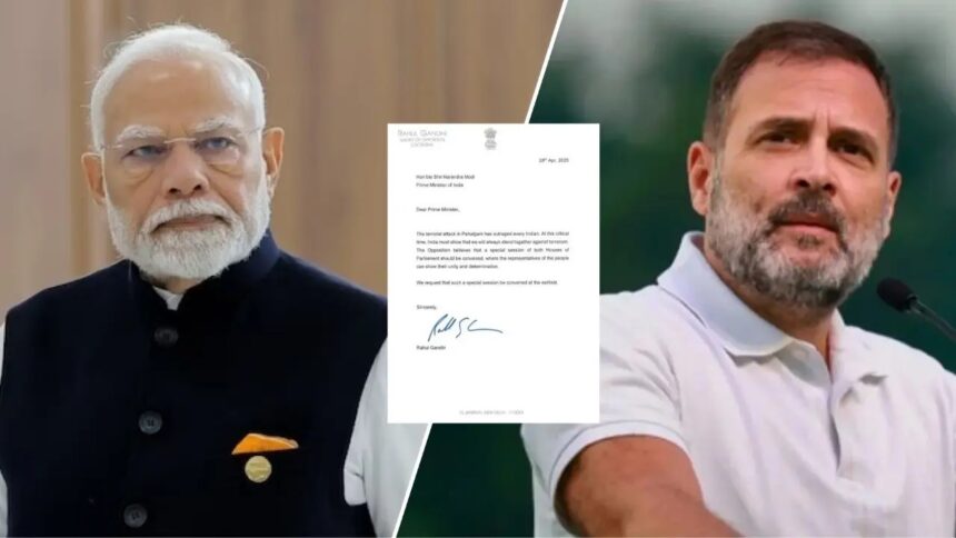नई दिल्ली: लोकसभा में नेता प्रतिपक्ष और कांग्रेस सांसद राहुल गांधी ने प्रधानमंत्री नरेंद्र मोदी को पत्र लिखा है। पत्र में राहुल ने अनुरोध किया है कि संसद के दोनों सदनों का विशेष सत्र जल्द से जल्द बुलाया जाए। पत्र में कहा गया है, “इस महत्वपूर्ण समय में भारत को यह दिखाना चाहिए कि हम आतंकवाद के खिलाफ हमेशा एकजुट हैं।
