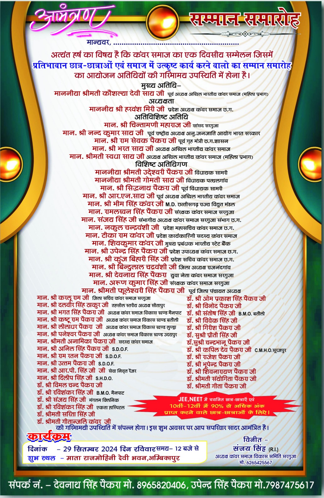 इस कार्यक्रम में मुख्य अतिथि के रूप में सीएम मैडम श्रीमती कौशल्या देवी साय, कंवर समाज प्रदेश अध्यक्ष हरवंश मिरी, सरगुजा सांसद चिंतामणि महाराज, पूर्व गृहमंत्री राम सेवक पैकरा सहित अन्य जनप्रतिनिधि उपस्थित रहेंगे। कंवर समाज के प्रदेश उपाध्यक्ष उपेंद्र सिंह पैकरा ने प्रदेश के कंवर समाज के लोगों से इस महासम्मेलन में भाग लेने का आग्रह किया है।