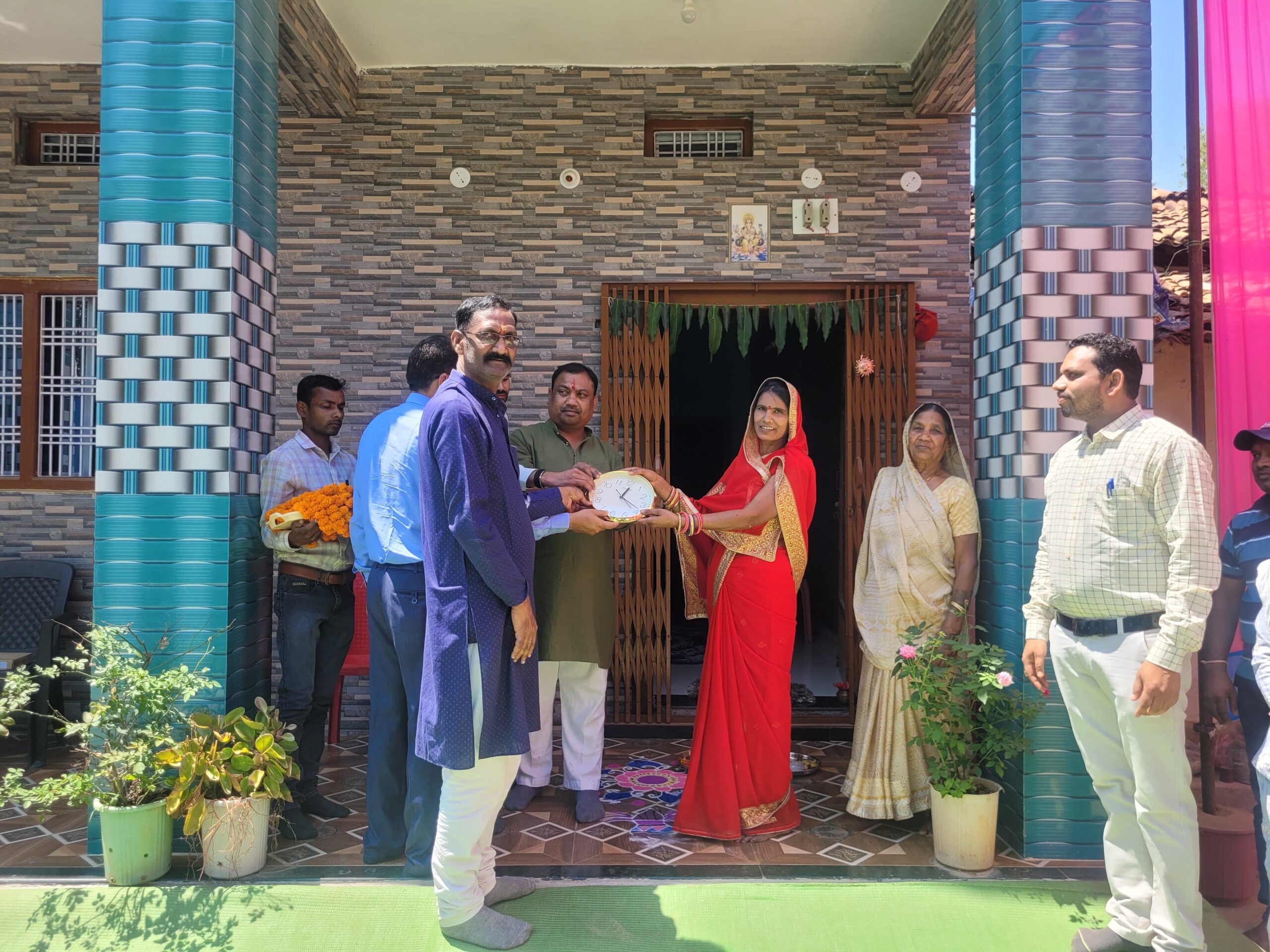 मुख्य कार्यपालन अधिकारी द्वारा गृह प्रवेश के अवसर पर हितग्राही को एक दीवाल घड़ी प्रदान की गई।