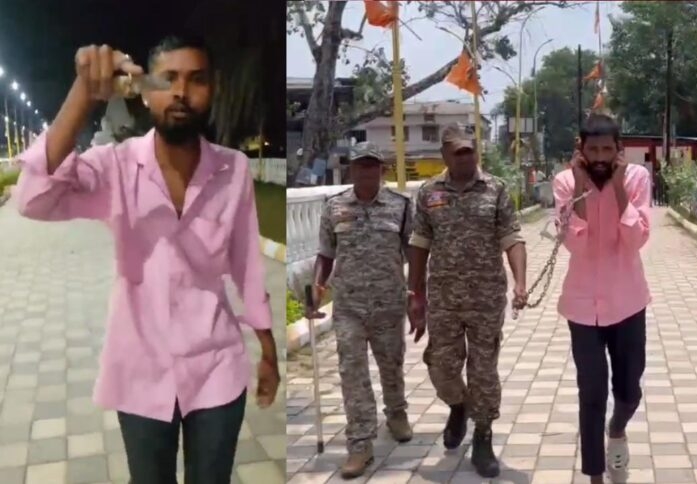 कांकेर। शहर में नशे के खिलाफ जारी पुलिस के ताबड़तोड़ एक्शन के बाद भी नशेड़ियों की हेकड़ी कम होने का नाम नहीं ले रही है, ऐसा ही एक वीडियो बीती रात सोशल मीडिया में वायरल हुआ जिसमें एक नशेड़ी युवक हाथ में चाकू लिए बीच शहर मरीन ड्राइव में गाली गलौज करता दिख रहा था, लेकिन जैसे ही वीडियो पुलिस के संज्ञान में आया पुलिस ने उसकी भाईगिरी निकाल दी, आरोपी युवक को पुलिस ने गिरफ्तार भी कर लिया है जिसके बाद युवक उसी जगह पर उठक बैठक करता हुआ और माफी मांगता नजर आ रहा है, साथ ही पुलिस को अपराधियों का बाप बता रहा है।