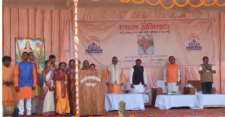 दिनेश बारी / लखनपुर लखनपुर: वंदे मातरम गीत के 150 वर्ष पूरे होने पर भव्य आयोजन सरगुजा जिले के लखनपुर क्षेत्र में राष्ट्रीय स्वयंसेवक संघ द्वारा वंदे मातरम गीत की 150वीं वर्षगांठ के उपलक्ष्य में भव्य सामूहिक गान कार्यक्रम आयोजित किया गया। इस अवसर पर छत्तीसगढ़ के मुख्यमंत्री विष्णु देव साय ने मुख्य अतिथि के रूप में शिरकत की। मुख्यमंत्री विष्णु देव साय हेलीकॉप्टर के माध्यम से नवापारा पहुंचे, जहां हेलीपैड पर भाजपा कार्यकर्ताओं ने गुलाब फूल और पुष्पगुच्छ देकर उनका भव्य स्वागत किया। इसके बाद मुख्यमंत्री सड़क मार्ग से लखनपुर के साक्षरता मिनी स्टेडियम पहुंचे, जहां कार्यक्रम आयोजित किया गया था। कार्यक्रम की प्रमुख झलकियां सामूहिक वंदे मातरम गान: लखनपुर हाई स्कूल ग्राउंड में वंदे मातरम गीत का सामूहिक गायन किया गया। विशिष्ट अतिथि: मुख्यमंत्री के साथ कृषि मंत्री राम विचार नेताम और जिले के तीनों विधायक उपस्थित रहे। राष्ट्रीय स्वयंसेवक संघ की भागीदारी: सरगुजा संभाग के संघ शाखा के सदस्यों ने आयोजन को सफल बनाया। मुख्यमंत्री का संबोधन मुख्यमंत्री ने अपने संबोधन में बताया कि एकल अभियान के तहत पूरे देश में ग्रामीण क्षेत्रों में एक लाख विद्यालय संचालित हो रहे हैं। छत्तीसगढ़ में करीब 3800 विद्यालय एकल परिवार के सहयोग से संचालित हैं, जो आदिवासी और ग्रामीण क्षेत्रों में शिक्षा और संस्कार का प्रसार कर रहे हैं। उन्होंने एकल विद्यालय को ग्रामीण विकास का आधार बताते हुए इसकी सराहना की। कार्यक्रम में बड़ी संख्या में संघ के सदस्य, जनप्रतिनिधि और स्थानीय ग्रामीण उपस्थित रहे। सामूहिक वंदे मातरम गायन ने पूरे कार्यक्रम को राष्ट्रभक्ति से ओतप्रोत बना दिया। Post Views: 1,470 Please Share With Your Friends Also Post navigation भाजपा ने नगर पंचायत सीतापुर एवं लखनपुर के पार्षद प्रत्याशियों की घोषणा की छत्तीसगढ़ में 76वां गणतंत्र दिवस धूमधाम से मनाया गया, मुख्यमंत्री ने परेड की सलामी ली