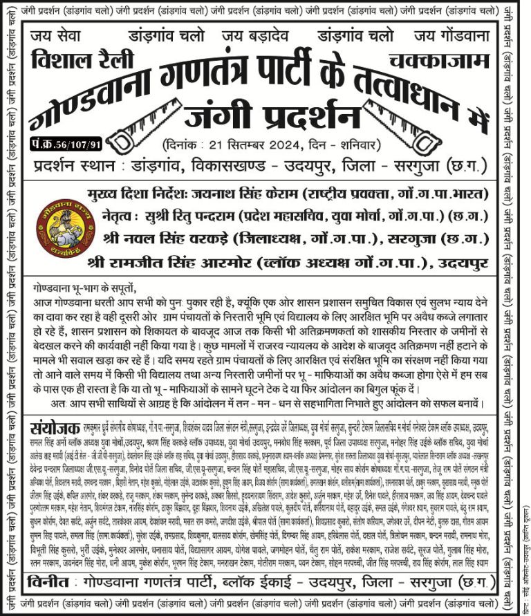 शासकीय भूमि पर जबरन अवैध कब्जा सहित अन्य मागों को लेकर शनिवार को सरगुजा जिला अंतर्गत विकास खंड उदयपुर के ग्राम डांडगांव में जंगी प्रर्दशन करने का ज्ञापन जिला से लेकर ब्लॉक लेबल के अधिकारियों को गोंडवाना गणतंत्र पार्टी द्वारा सौंपा गया है
