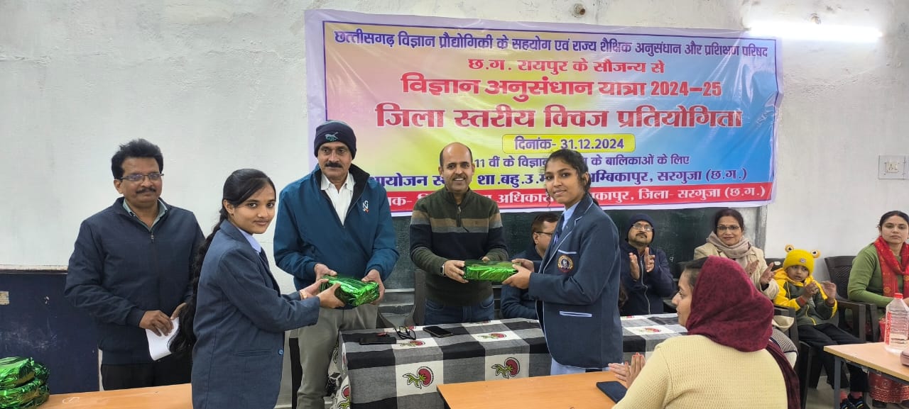 अंबिकापुर।शासकीय बहुउद्देशीय उच्चतर माध्यमिक विद्यालय, अंबिकापुर में मंगलवार को जिला स्तरीय विज्ञान अनुसंधान यात्रा 2024-25 क्विज प्रतियोगिता का आयोजन किया गया। यह प्रतियोगिता छत्तीसगढ़ विज्ञान एवं प्रौद्योगिकी परिषद और राज्य शैक्षिक अनुसंधान और प्रशिक्षण परिषद, रायपुर के सहयोग से आयोजित की गई। प्रतियोगिता का विवरण प्रतियोगिता में सरगुजा जिले के सात विकासखंडों—अंबिकापुर, बतौली, लखनपुर, लुंड्रा, मैनपाट, सीतापुर और उदयपुर के कक्षा 11वीं के विज्ञान संकाय के छात्रों ने भाग लिया। विजेताओं की सूची: प्रथम स्थान: प्रियांशी जायसवाल (विकासखंड सीतापुर) द्वितीय स्थान: आर्ची गुप्ता और काजल राजवाड़े (विकासखंड उदयपुर), गीतिका तिवारी (विकासखंड उदयपुर) तृतीय स्थान: स्पर्श सोनी और तनीषा ताम्रकार (विकासखंड अंबिकापुर) मुख्य अतिथि का संदेश कार्यक्रम के मुख्य अतिथि एडीपीओ रमेश सिंह ने छात्रों को वैज्ञानिक दृष्टिकोण विकसित करने की प्रेरणा दी और विज्ञान के क्षेत्र में नई खोजों के प्रति जागरूक रहने का आह्वान किया। विशेषज्ञों के सुझाव एपीसी रविशंकर पांडेय ने प्रतिभागियों को अनुसंधान, नई तकनीकों और वैश्विक विज्ञान के क्षेत्र में हो रही प्रगतियों पर ध्यान केंद्रित करने की सलाह दी। उपस्थित गणमान्य इस अवसर पर सरगुजा जिले के प्रतिष्ठित शिक्षकों में सतीश पांडे, अमरदीप गुप्ता, नूतन सिंह, आस्था जायसवाल, और नित्यानंद पाठक उपस्थित रहे। कार्यक्रम संचालन कार्यक्रम का सफल संचालन श्री सिरीश नंदे और श्री शैलेंद्र सिंह सेंगर ने किया। जिला स्तरीय विज्ञान अनुसंधान यात्रा क्विज प्रतियोगिता का यह आयोजन छात्रों में विज्ञान और प्रौद्योगिकी के प्रति रुचि को प्रोत्साहित करने और उन्हें नवीन अनुसंधानों की ओर प्रेरित करने का उत्कृष्ट प्रयास था। Post Views: 211 Please Share With Your Friends Also Post navigation जमीन रजिस्ट्री के नाम पर धोखाधड़ी कारित कर 17 लाख 50 हजार की ठगी की आरोपियों को पुलिस ने किया गिरफ्तार परसा कोल ब्लॉक: ग्राम हरिहरपुर के लिए साल्ही के निवासियों ने पुनर्वास योजना पर जताई आपत्ति