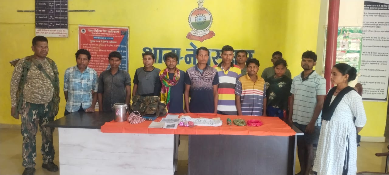 बीजापुर : जिले में चलाये जा रहे माओवादी विरोधी अभियान के तहत् दिनांक 15/04/2025 को थाना उसूर से थाना एवं कोबरा 205, 210 वाहिनी का बल टेकमेटला की ओर एरिया डॉमिनेशन पर निकली थी। अभियान के दौरान टेकमेटला के जंगल से विस्फोटक के साथ 07 सक्रिय माओवादियों को पकड़ा गया, जिनके कब्जे से टीफिन बम, कार्डेक्स वायर, बिजली का तार एवं प्रतिबंधित संगठन का पाम्पलेट आदि बरामद किया गया:- 1. देवा माड़वी (रेखापल्ली मिलिशिया सदस्य) पिता अंदा माड़वी उम्र 23 वर्ष निवासी रेखापल्ली थाना बासागुड़ा2. चैनु माड़वी (रेखापल्ली मिलिशिया सदस्य) पिता मंगड़ू माड़वी उम्र 20 वर्ष निवासी रेखापल्ली थाना बासागुड़ा3. मल्ला माड़वी (रेखापल्ली मिलिशिया सदस्य) पिता हुंगा उम्र 24 वर्ष निवासी रेखापल्ली थाना बासागुड़ा4. माड़वी लखमा (रेखापल्ली DAKMS सदस्य) पिता हड़मा उम्र 45 वर्ष निवासी रेखापल्ली थाना बासागुड़ा5. लाला मीड़ियम (रेखापल्ली कृषि शाखा सदस्य) पिता कोसा उम्र 30 वर्ष निवासी रेखापल्ली थाना बासागुड़ा6. अंदा माड़वी (मारूड़बाका आरपीसी जनताना सदस्य) पिता देवा उम्र 32 वर्ष निवासी रेखापल्ली थाना बासागुड़ा7. गंगा माड़वी (रेखापल्ली DAKMS सदस्य) पिता देवा उम्र 39 वर्ष निवासी रेखापल्ली थाना बासागुड़ा थाना जांगला से थाना जांगला एवं डीआरजी का संयुक्त बल बेलचर, भुर्रीपानी एवं कोटमेटा की ओर एरिया डोमिनेशन पर निकली थी। अभियान के दौरान बेलचर के जंगल से विस्फोटक के साथ 06 सक्रिय माओवादियों को पकड़ा गया, जिनके कब्जे से टीफिन बम, कार्डेक्स वायर, डेटोनेटर, बिजली का तार, बैटरी, खुदाई का औजार, टंगिया आदि बरामद किया गया:- 1. समीला ओयाम (आरपीसी सीएनएम सदस्य) पति रमेश ओयाम उम्र 22 वर्ष निवासी छोटेपल्ली पटेलपारा थाना भैरमगढ़ जिला बीजापुर2. सन्तु ओयाम (भूमकाल मिलिशिया सदस्य) पिता सुक्कू ओयाम उम्र 23 वर्ष निवासी बड़ेपल्ली पटेलपारा थाना भैरमगढ़ जिला बीजापुर3. सायबो माड़वी (भूमकाल मिलिशिया सदस्य) पिता हिड़मा माड़वी उम्र 39 वर्ष निवासी बड़ेपल्ली पटेलपारा थाना भैरमगढ़ जिला बीजापुर4. रमेश आरकी (आरपीसी मिलिशिया सदस्य) पिता पकलू आरकी उम्र 19 वर्ष निवासी कोलनार थाना भैरमगढ़ जिला बीजापुर5. शंकर आरकी (आरपीसी मिलिशिया सदस्य) पिता पकलू आरकी उम्र 22 वर्ष निवासी कोलनार थाना भैरमगढ़ जिला बीजापुर6. कोहले ओयाम (केएएमएस सदस्य) पति सुखराम ओयाम उम्र 22 वर्ष जाति निवासी कोलनार थाना भैरमगढ़ जिला बीजापुर थाना नेलसनार से थाना बल एवं कैम्प हेमलापारा 08/सी वाहिनी की संयुक्त कार्यवाही में कांदाकरका की ओर एरिया डोमिनेशन पर निकली थी। अभियान के दौरान कांदाकरका के जंगल से विस्फोटक के साथ 09 सक्रिय माओवादियों को पकड़ा गया। जिनके कब्जे से टीफिन बम, कार्डेक्स वायर, डेटोनेटर, बिजली का तार, बैटरी, खुदाई का औजार, 