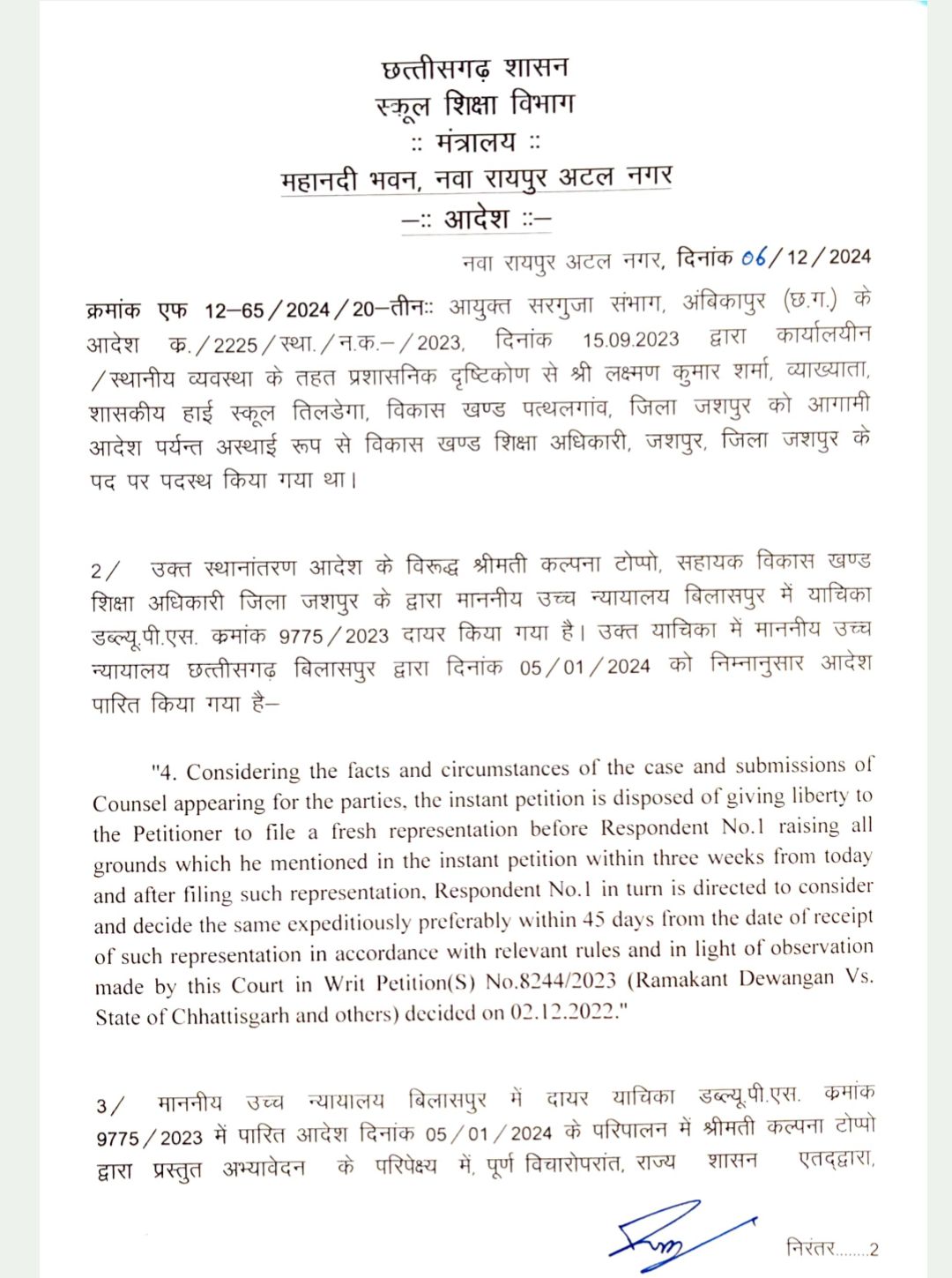 जशपुर जिले में उच्च न्यायालय के आदेश के आधार पर शासन से जारी हुआ आदेश। जशपुरछत्तीसगढ़ शासन के स्कूल शिक्षा विभाग ने उच्च न्यायालय बिलासपुर के निर्देशानुसार दो अधिकारियों का स्थानांतरण करते हुए नई नियुक्तियां की हैं। यह आदेश 6 दिसंबर 2024 को मंत्रालय, नवा रायपुर अटल नगर से जारी किया गया। आदेश के तहत, व्याख्याता लक्ष्मण शर्मा को जशपुर के प्रभारी विकासखंड शिक्षा अधिकारी पद से हटाकर शासकीय उच्चतर माध्यमिक विद्यालय तिलडेगा शिक्षकीय कार्य हेतु भेजा गया है।वहीं हाईकोर्ट में अपीलकर्ता श्रीमती कल्पना टोप्पो, सहायक विकासखंड शिक्षा अधिकारी, जशपुर को प्रभारी BEO विकास खंड जशपुर बनाया गया है। यह निर्णय माननीय उच्च न्यायालय बिलासपुर द्वारा 5 जनवरी 2024 को दिए गए निर्देश के अनुपालन में लिया गया है। उच्च न्यायालय ने याचिका क्रमांक 9775/2023 पर सुनवाई करते हुए आदेश दिया था कि प्रशासनिक मामलों में उचित समय सीमा के भीतर कार्रवाई की जाए।इस आदेश के तहत, छत्तीसगढ़ शासन ने न्यायालय के आदेशों का पालन करते हुए शिक्षा व्यवस्था में सुधार और प्रशासनिक प्रक्रिया को सुचारू बनाने की पहल की है। देखें आदेश की कॉपी 👇 Post Views: 476 Please Share With Your Friends Also Post navigation धरमजयगढ़ पुलिस का बड़ा खुलासा: ठगी के नेटवर्क का पर्दाफाश, महिला आरोपी गिरफ्तार लखनपुर ब्लॉक की प्राथमिक और माध्यमिक शालाओं में मनमानी परीक्षा प्रक्रिया पर उठे सवाल