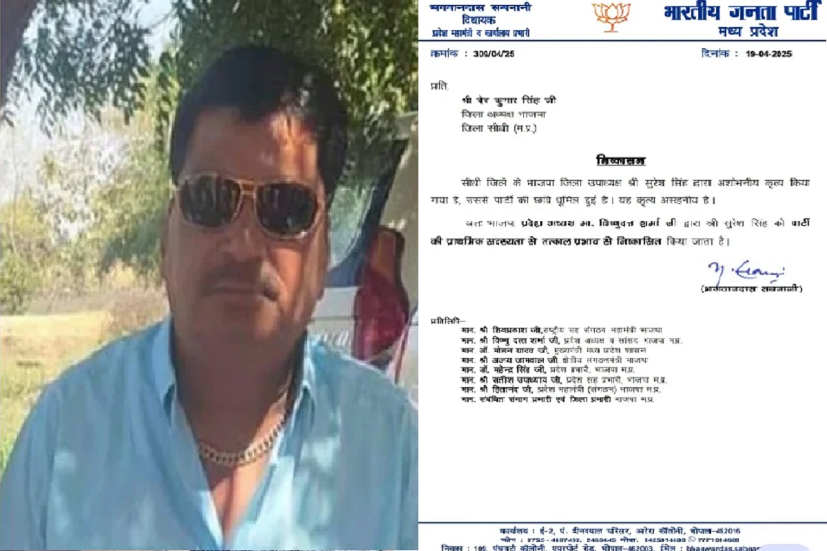 BJP District Vice President : देश के अलग-अलग हिस्सों में महिलाओं से संबंधित अपराध लगातार बढ़ रहे हैं। अब तो ऐसे मामलों में राजनीतिक लोगों की संलिप्तता भी सामने आने लगी है। इस बीच अब मध्यप्रदेश के सीधी जिले के भाजपा उपाध्यक्ष सुरेश सिंह चौहान पर लड़की से छेड़छाड़ का आरोप लगा है। इस आरोप के बाद भाजपा ने एक्शन लेते हुए उन्हें पार्टी से निष्कासित कर दिया है। प्रदेश अध्यक्ष VD शर्मा की सहमति के बाद इस संबंध में आदेश जारी कर दिया गया है। भाजपा की ओर से जारी आदेश में कहा गया है कि”सीधी जिले के भाजपा जिला उपाध्यक्ष सुरेश सिंह द्वारा अशोभनीय कृत्य किया गया है, उससे पार्टी की छवि धूमिल हुई है। यह कृत्य असहनीय है।अतः भाजपा प्रदेश अध्यक्ष मा. विष्णुदत्त शर्मा जी द्वारा श्री सुरेश सिंह को पार्टी की प्राथमिक सदस्यता से तत्काल प्रभाव से निष्कासित किया जाता है।” जांच में सही पाई गई शिकायत बताया जा रहा है कि बीते दिनों एक प्रेस कार्यालय में कंप्यूटर ऑपरेटर के पद पर कार्यरत युवती के साथ भाजपा जिला अध्यक्ष सुरेश सिंह ने अश्लील हरकतें की थी, जिसकी शिकायत युवती ने भाजपा जिला अध्यक्ष देव कुमार सिंह चौहान व सीधी विधायक रीति पाठक के सामने की. वहीं अश्लीलता की शिकायत को गंभीरता से लेते हुए जब जांच पड़ताल की गई तो जांच सही पाया गया. वहीं भाजपा जिला उपाध्यक्ष के करतूत से पार्टी की भी छवि धूमिल हुई. सोशल मीडिया में यह खबर वायरल होने के बाद मामला भोपाल तक पहुंच गया. ऐसे में भाजपा प्रदेश अध्यक्ष विष्णु दत्त शर्मा के द्वारा जिला उपाध्यक्ष सुरेश सिंह को पार्टी की प्राथमिक सदस्यता से निष्कासित कर दिया गया है. हालांकि अभी मामले को लेकर पुलिस से कोई शिकायकत नहीं की गई है। Post Views: 236 Please Share With Your Friends Also Post navigation CG Crime : पति करता रह गया डांस … जेठ कर गया बहू के साथ कांड, मिली ऐसी हालत में देखकर फटी रह गई आंख पूर्व DGP का मिला शव : बंगले में चाकूओं से वार कर ले ली जान, मचा हड़कंप, पत्नी-बेटी को किया गया गिरफ्तार