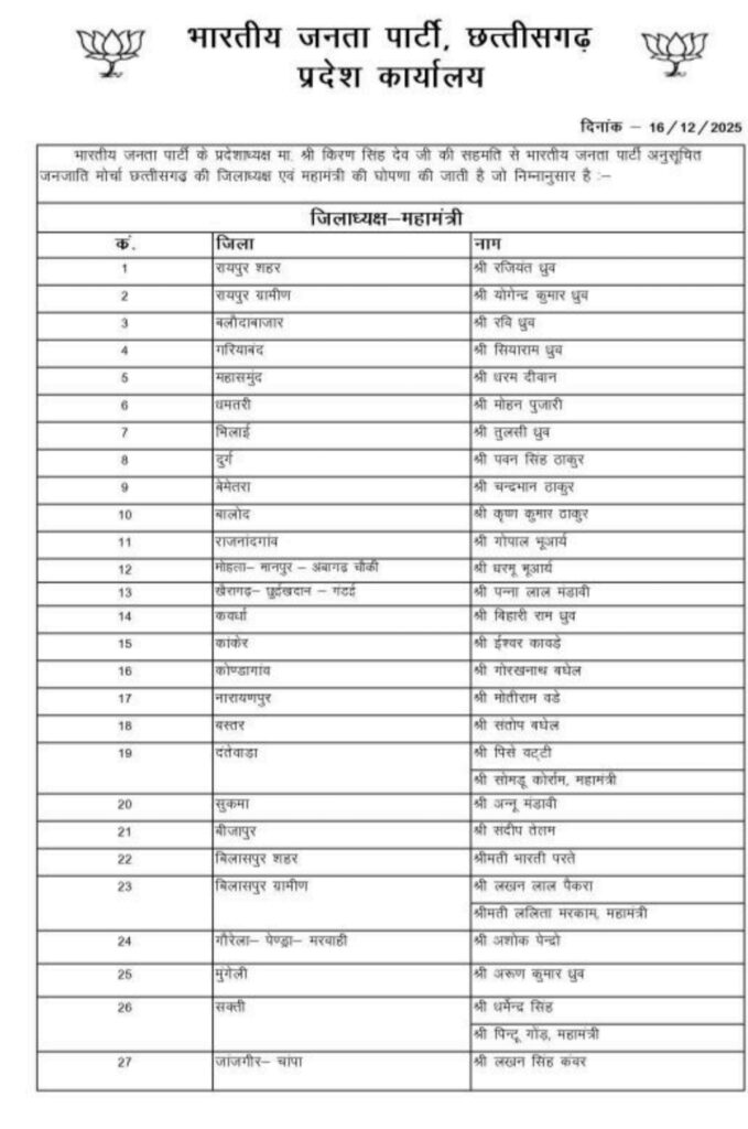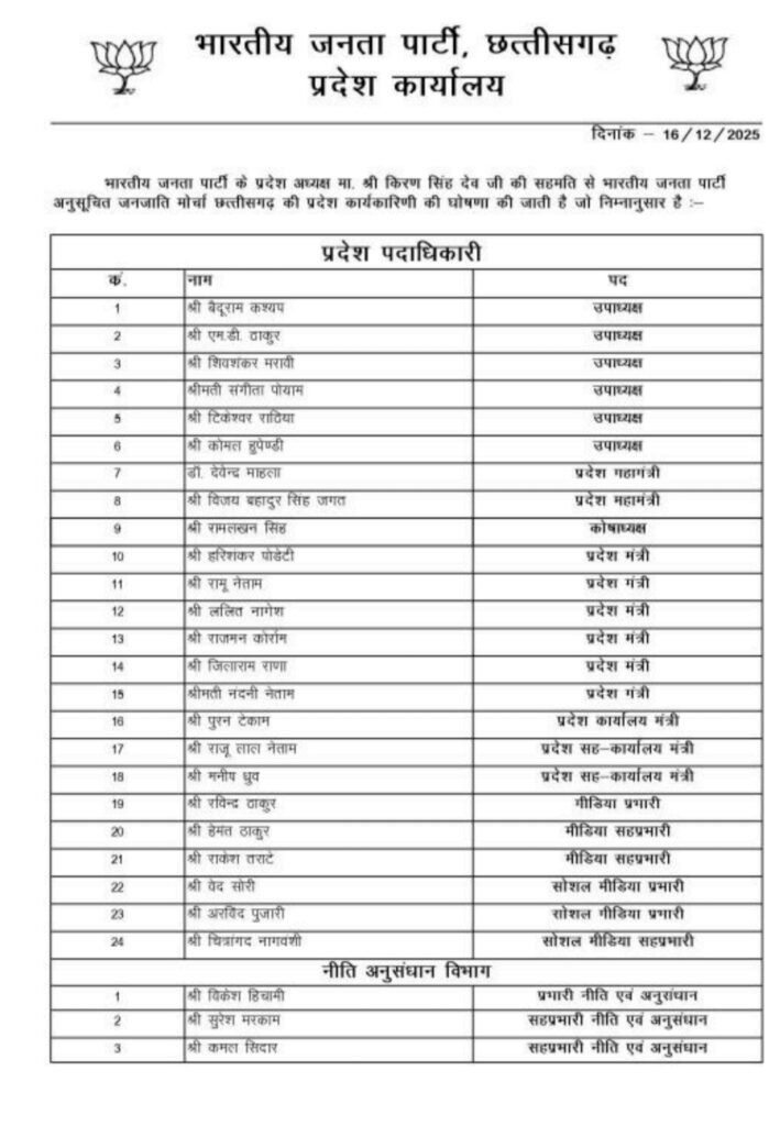 CG: भाजपा ने जारी की अनुसूचित जनजाति मोर्चा छत्तीसगढ़ की सूची