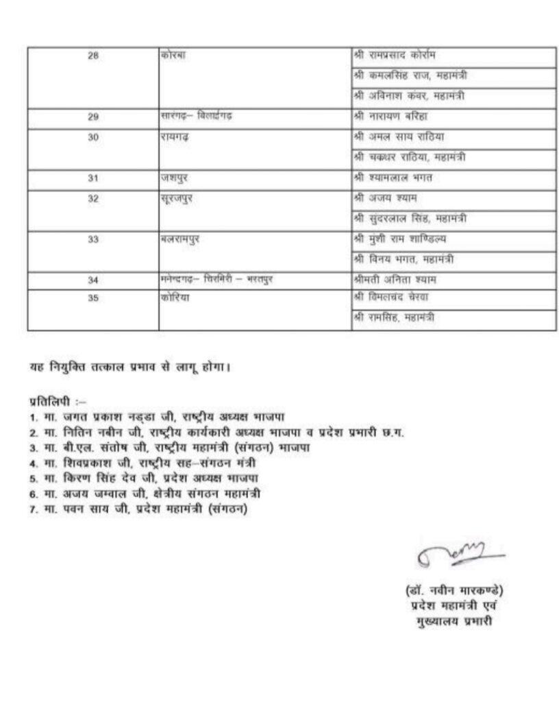 रायपुर :- भाजपा अपनी टीम में लगातार पदाधिकारियों की नियुक्ति कर रही है। जिसमें कुछ अनुभवी तो कुछ नए चेहरों को मौका दे रही है। वहीं देर शाम भाजपा ने अनुसूचित जनजाति मोर्चा छत्तीसगढ़ की जिलाध्यक्ष, महामंत्री और प्रदेश पदाधिकारियों की घोषणा की है।