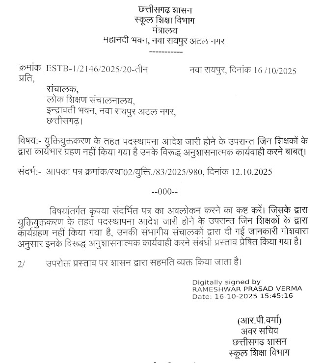 लोक शिक्षण संचालनालय ने इस गंभीर लापरवाही पर सख्त रुख अपनाया है। संचालनालय ने कहा कि शासन ने ऐसे शिक्षकों के खिलाफ अनुशासनात्मक कार्रवाई की अनुमति प्रदान कर दी है। यह स्पष्ट किया गया कि युक्तियुक्तकरण के बाद पदस्थापना आदेश का पालन न करना न केवल प्रशासनिक उल्लंघन है, बल्कि यह छात्रों के हितों से भी खिलवाड़ है।