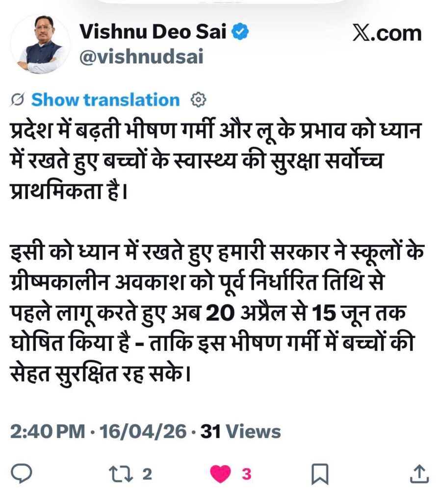 रायपुर। छत्तीसगढ़ में अप्रैल माह के साथ ही गर्मी ने तेज तेवर दिखाने शुरू कर दिए हैं। प्रदेश के कई हिस्सों में पिछले कुछ दिनों से तापमान लगातार बढ़ रहा है, जिससे आम जनजीवन प्रभावित होने लगा है। बढ़ती गर्मी और लू की स्थिति को देखते हुए राज्य सरकार ने बड़ा निर्णय लेते हुए स्कूलों में ग्रीष्मकालीन अवकाश घोषित कर दिया है। प्राप्त जानकारी के अनुसार, रायपुर, बिलासपुर और दुर्ग सहित कई जिलों में तापमान 40 डिग्री सेल्सियस के पार पहुंच चुका है। इस बीच, स्कूली बच्चों की तबीयत बिगड़ने की शिकायतें भी सामने आई थीं, जिसे गंभीरता से लेते हुए शासन ने यह फैसला लिया। जारी आदेश के मुताबिक, प्रदेश के सभी स्कूलों में 20 अप्रैल 2026 से 15 जून 2026 तक कक्षाओं का संचालन पूरी तरह बंद रहेगा। इस अवधि में विद्यार्थियों को गर्मी से राहत मिलेगी और अभिभावकों को भी चिंता से निजात मिलेगी। Post Views: 35 Please Share With Your Friends Also Post navigation रायपुर में पति की हत्या; इस बात पर पत्नी और बेटी ने दी ऐसी दर्दनाक मौत, कांप जाएगी आपकी रूह 13 साल में दोगुना से ज्यादा हुआ लोन-डिपॉजिट, रायपुर बना नंबर-1