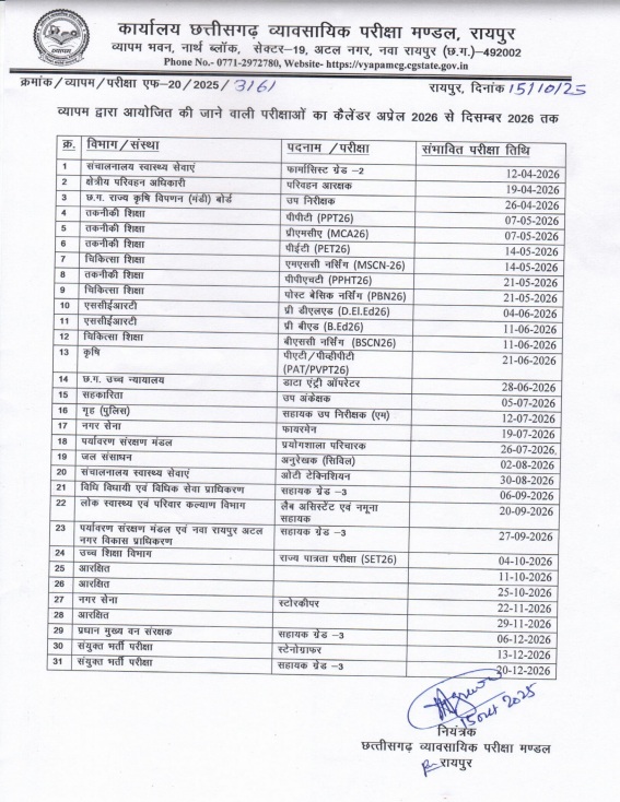 रायपुर। सरकारी नौकरियों की तैयारी में लगे युवाओं के लिए बड़ी खुशखबरी है। छत्तीसगढ़ व्यावसायिक परीक्षा मंडल की ओर से वर्ष 2026 में होने वाले भर्तियों एवं प्रवेश परीक्षाओं के लिए एग्जाम कैलेंडर जारी कर दिया गया है। CG Vyapam Exam Calendar 2025 के अनुसार इस वर्ष छत्तीसगढ़ राज्य में कुल 31 भर्ती परीक्षाओं/ प्रवेश परीक्षाओं का आयोजन किया जायेगा। अभ्यर्थी इस एग्जाम कैलेंडर के अनुसार अभी से तैयारियां स्टार्ट कर सकते हैं।