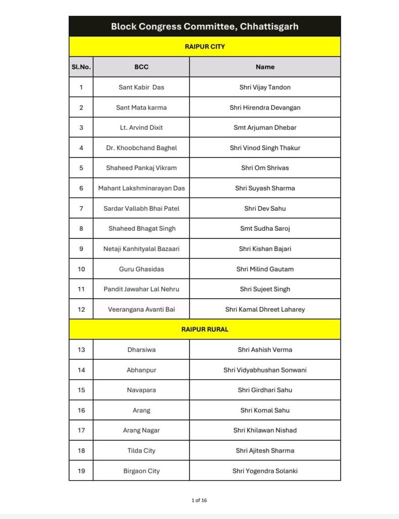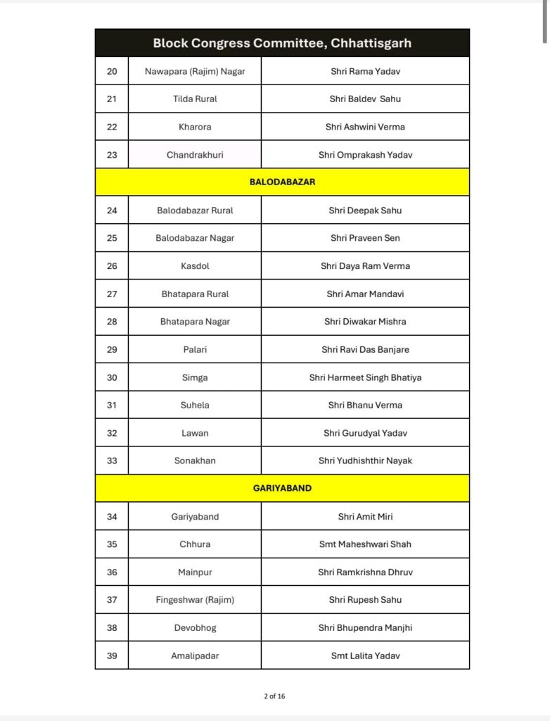 रायपुर:-छत्तीसगढ़ प्रदेश कांग्रेस ने लम्बी कवायद और मंथन के बाद छत्तीसगढ़ के 307 ब्लॉक के लिए अध्यक्षों की सूची जारी कर दी है। आप भी देखें पूरी लिस्ट