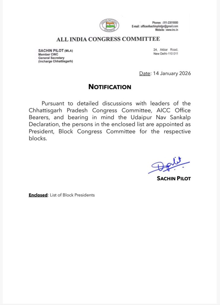 CG: कांग्रेस ने जारी की 307 ब्लॉक अध्यक्षों की सूची.. लम्बी कवायद के बाद फाइनल हुए ये नाम