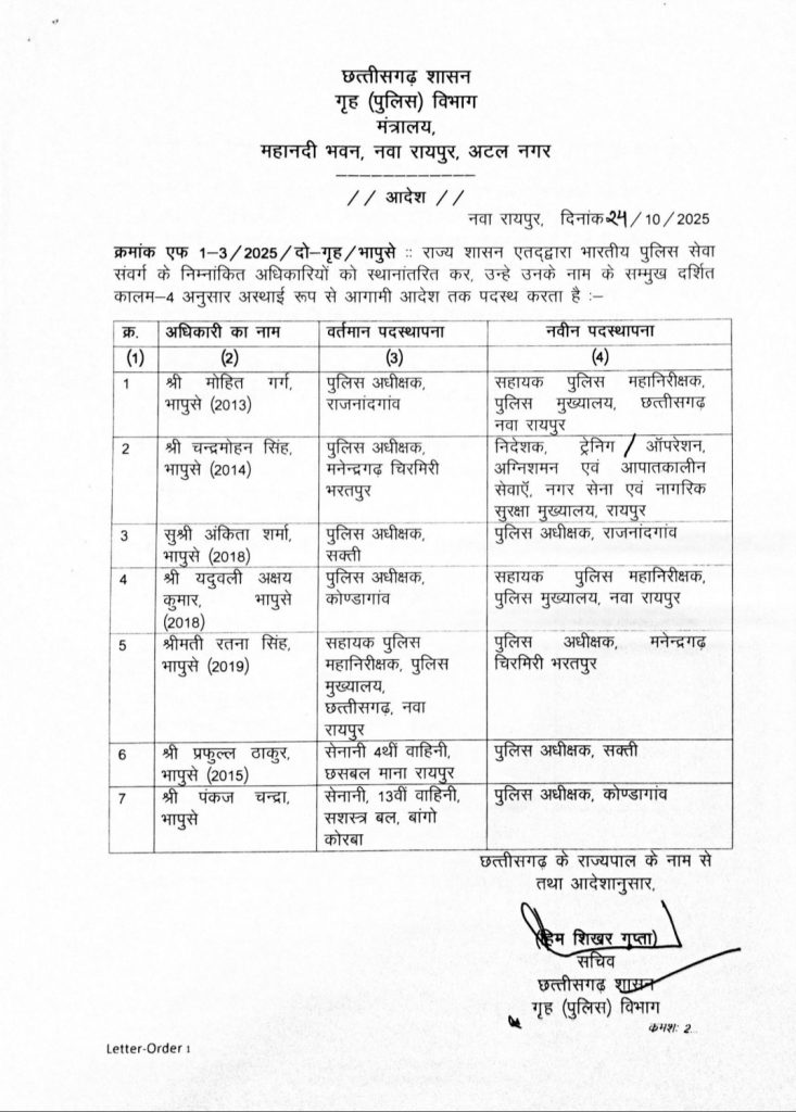 CG IPS Transfer News : छत्तीसगढ़ में आईपीएस अधिकारियों का तबादला, देखें आदेश…