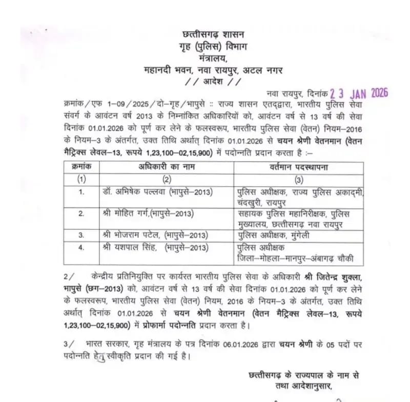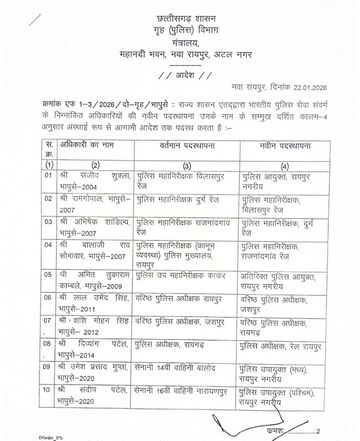 CG: बड़े पैमाने पर SP का तबादला जल्द!.. नए प्रमोशन और पोस्टिंग के बाद अब ट्रांसफर की बारी रायपुर : राजधानी रायपुर में कमिश्नरी सिस्टम की विधिवत शुरुआत हो चुकी है। पहले पुलिस आयुक्त IPS डॉ. संजीव शुक्ला ने अपने मातहत एडिशनल सीपी, डीसीपी और एसीपी के साथ 23 जनवरी को पदभार ग्रहण किया और कामकाज की शुरुआत की। 15 सीनियर पुलिस अफसरों का तबादला राजधानी में कमिश्नरी सिस्टम के सेटअप के लिए पिछले दिनों बड़े पैमाने पर भापुसे और राज्य पुलिस सेवा के अधिकारियों का तबादला किया गया था। नए सीपी और तत्कालीन बिलासपुर आईजी डॉ. संजीव शुक्ला समेत 15 अफसरों के कार्यस्थल में बड़ा फेरबदल हुआ था। इसी तरह कल यानी शुक्रवार को प्रदेश के सीनियर आईपीएस अफसरों को प्रमोशन दिया गया है। जारी पदोन्नति आदेश के मुताबिक 2001 बैच में एडीजी बनने वालों में डॉ. आनंद छाबड़ा को आईजी से एडीजी प्रमोट किया गया है। वहीं 2008 बैच में प्रशांत अग्रवाल, मिलना कुर्रे, नीथू कमल और डी. श्रवण को आईजी प्रमोट किया गया है। पदोन्नत अफसरों को नई पोस्टिंग नहीं आईपीएस रजनेश सिंह, शशिमोहन सिंह, राजेश अग्रवाल और विजय अग्रवाल समेत 8 अफसरों को प्रमोट कर डीआईजी बना दिया गया है। सेलेक्शन ग्रेड मिलने के बाद जिलों में पोस्टेड एसपी का पदनाम बदलकर एसएसपी हो जाएगा। इनमें जितेंद्र शुक्ला, मोहित गर्ग, यशपाल सिंह, अभिषेक पल्लव और भोजराम पटेल शामिल हैं। भोजराम इस समय मुंगेली के एसपी हैं। हालांकि इन अफसरों को अभी नई जगहों पर पोस्टिंग नहीं दी गई है। ऐसे में संभावना जताई जा रही है कि राज्य के गृह विभाग द्वारा गणतंत्र दिवस के बाद एक बड़ी सर्जरी हो सकती है। डीआईजी के तौर पर पदोन्नत हुए अफसर जिलों में एसएसपी का पद छोड़ेंगे, वहीं कमिश्नरी सिस्टम के लिए राजधानी बुलाए गए अफसरों की जगह पर नए अधिकारियों की तैनाती की जाएगी। वहीं कई ऐसे जिले भी हैं जहां के पुलिस अधीक्षक लंबे वक्त से तैनात हैं, लिहाजा उन्हें भी नए जिलों में कमान दी जा सकती है। Post Views: 26 Please Share With Your Friends Also Post navigation CG: व्हाट्सप्प पर ‘इलाज’ पड़ा भारी… फोन पर एक्स-रे दिखा ली राय और कर दिया प्लास्टर, अब मासूम सूजन और दर्द से बेहाल CG: 9वीं के छात्र ने 10वीं के छात्र को मारा चाकू, हालत गंभीर, परिजनों का भड़का गुस्सा