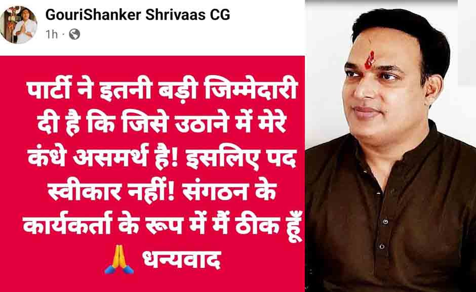 रायपुर : छत्तीसगढ़ की साय सरकार ने निगम मंडल में नियुक्तियों की बहुप्रतिक्षीत सूची बुधवार की रात भले ही जारी कर दी है, लेकिन सरकार की इस सूची में पद से वंचित रह गये बड़े नेताओं के साथ ही जिन्हे सम्मानजनक पद नही मिला उन नेताओं में असंतोष बढ़ने लगा है। लिस्ट के जारी होते ही छत्तीसगढ़ राज्य केश शिल्पी कल्याण बोर्ड के उपाध्यक्ष बने गौरीशंकर श्रीवास ने इस नियुक्ति को ठुकराते हुए नाराजगी व्यक्त की है। उन्होने एक्स पर लिखा कि….“पार्टी ने इतनी बड़ी जिम्मेदारी दी है कि जिसे उठाने में मेरे कंधे असमर्थ हैं! इसलिए पद स्वीकार नहीं! संगठन के कार्यकर्ता के रूप में मैं ठीक हूँ। धन्यवाद! गौरतलब है कि छत्तीसगढ़ में सत्ता परिवर्तन के बाद से ही पार्टी के बड़े नेताओें के साथ ही सालों से पार्टी के लिए ऐढ़ी-चोटी लगाने वाले नेताओं को निगम मंडल में नियुक्ति की उम्मींदे थी। लेकिन प्रदेश में साय सरकार के करीब डेढ़ साल का कार्यकाल बीत जाने के बाद भी निगम मंडल में नियुक्तियां नही हो सकी थी। ऐसे में नगरीय निकाय चुनाव के बाद निगम मंडल में नियुक्तियों की लिस्ट जारी होने की उम्मींदे बढ़ गयी थी। वहीं पार्टी के बड़े नेताओं के साथ ही ऐसे नेता जिन्हे पिछले चुनाव में टिकट से वंचित रखा गया, उन्हे निगम मंडल में बड़ी जवाबदारी मिलने की उम्मींदे थी। इन सारे कयासों के बीच बुधवार की रात सरकार की तरफ से 36 निगम मंडल के अध्यक्ष-उपाध्यक्षों के नाम तय कर सूची जारी किये गये। इस सूची के जारी होते ही एक तरफ उन नेताओं के चेहरे खिल गये, जिन्हे अध्यक्ष पद की कुर्सी मिल गयी। वहीं दूसरी तरफ उन नेताओं के अरमान पर पानी फिर गये जिन्होने पिछले डेढ़ साल से निगम मंडल में लाल बत्ती के सपने संजोए बैठे थे। जारी सूची को लेकर जिस तरह से बड़े नेता असंतोष व्यक्त कर रहे है, उससे ऐसा ही लगता है, जैसे सरकार ने उन्हे उनके कद के मुताबिक पद नही दिया या फिर पद के काबिल ही नही समझा। ऐसे में बीजेपी के उन नेताओ के बीच अब असंतोष बढ़ने लगा है,जिन्हे निगम मंडल में कुर्सी मिलने की बड़ी उम्मींदे थी। गौरीशंकर श्रीवास ने उपाध्यक्ष के पद को ठुकराया सरकार द्वारा जारी निगम मंडल की सूची में भाजपा के वरिष्ठ नेता और प्रवक्ता गौरीशंकर श्रीवास को छत्तीसगढ़ राज्य केश शिल्पी कल्याण बोर्ड का उपाध्यक्ष बनाया गया है, जबकि अध्यक्ष का पद मोना सेन को दिया गया। लेकिन गौरीशंकर श्रीवास को सरकार के तरफ से मिली ये नियुक्ति रास नही आयी। लिहाजा उन्होने सोशल मीडिया प्लेटफार्मस में उपाध्यक्ष के पद पर मिली नियुक्ति को ठुकराते हुए अपनी नाराजगी व्यक्त की है। उन्होने X पर लिखा….“पार्टी ने इतनी बड़ी जिम्मेदारी दी है कि जिसे उठाने में मेरे कंधे असमर्थ हैं! इसलिए पद स्वीकार नहीं! संगठन के का