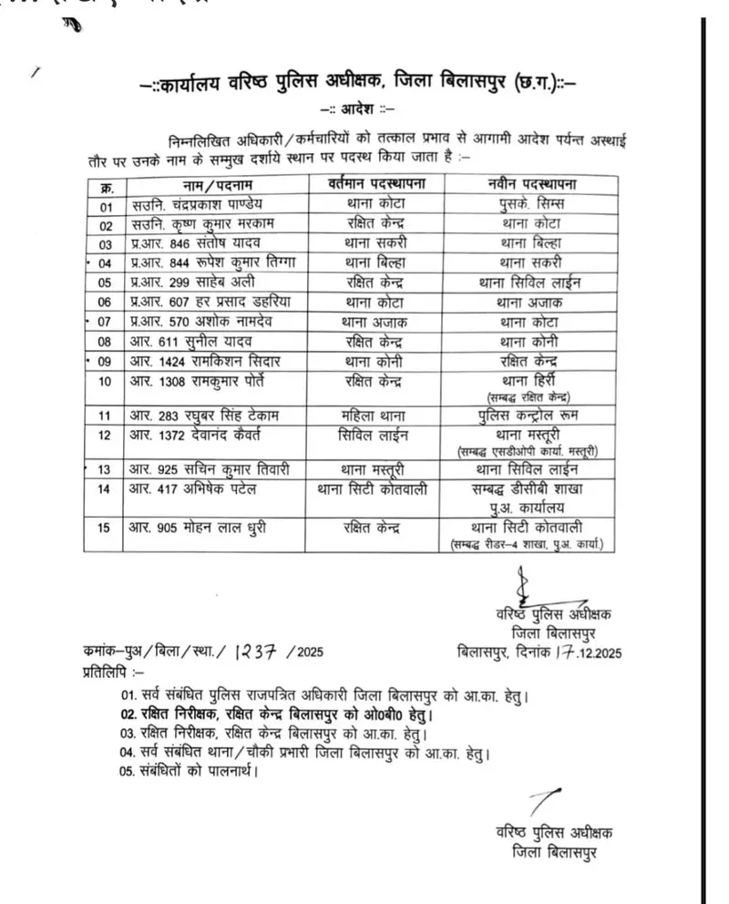 CG: SP ने 15 पुलिसकर्मियों का किया तबादला देखे पूरी लिस्ट रायपुर :- छत्तीसगढ़ के बिलासपुर पुलिस विभाग में बड़ा फेरबदल हुआ है। एसपी बिलासपुर रजनेश सिंह ने जिले के 15 पुलिसकर्मियों का तबादला किया है। जारी आदेश में 2 एएसआई, 5 हेड कांस्टेबल और 8 कांस्टेबल शामिल हैं, जिनका ट्रांसफर किया गया है। Post Views: 96 Please Share With Your Friends Also Post navigation CG: मोबाइल के लिए पिता ने डांटा तो बेटी ने उठाया खौफनाक कदम, परिवार में छाया मातम भव्य चतुर्थ श्री श्याम गुणगान का होगा आयोजन