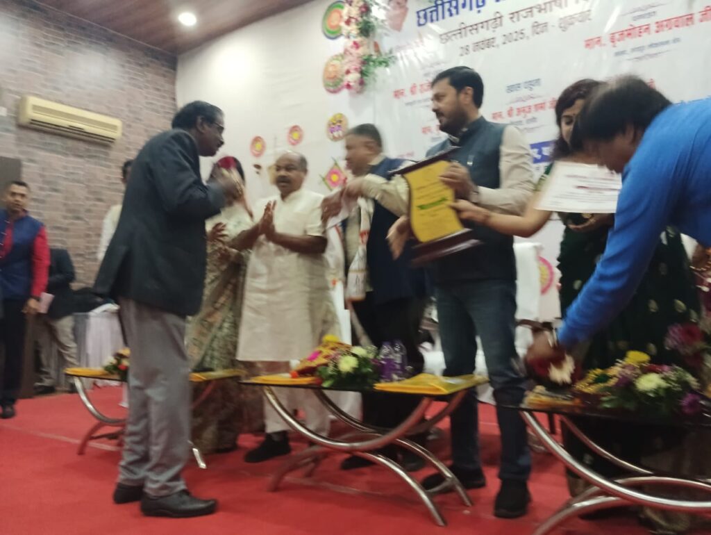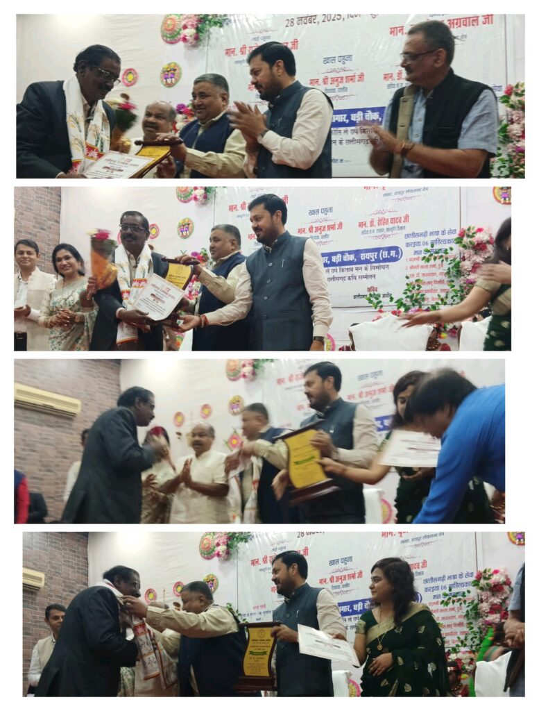 लखनपुर :- छत्तीसगढ़ राजभाषा आयोग सम्मान समारोह दिनांक 28 11 2025 दिन शुक्रवार को एसपी जायसवाल निवासी लखनपुर सरगुजा को 28 पुस्तक लिखने पर प्रांत स्तरीय सम्मान राज्य के संस्कृति मंत्री राजेश अग्रवाल सांसद बृजमोहन अग्रवाल विधायक पुरंदर मिश्र एवं विधायक अनुज शर्मा संचालक संस्कृति एवं राजभाषा आयोग विवेक आर्य दो अभिलाष बिहार सचिन छत्तीसगढ़ राजभाषा आयोग के हाथों रायपुर संस्कृति भवन में सम्मानित किया गया.कुल राज्य भर के 6 साहित्यकार को सम्मानित किया गया.
