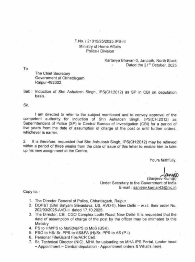 मिनिस्ट्री ऑफ़ होम अफेयर्स के अवर सचिव संजीव कुमार के द्वारा छत्तीसगढ़ के मुख्य सचिव को पत्र भेजा है। जारी पत्र के अनुसार 2012 बैच के आईपीएस आशुतोष सिंह को डेपुटेशन के लिए रिलीव करने को कहा गया है। आशुतोष सिंह को केंद्रीय अन्वेषण ब्यूरो ( सीबीआई) में पुलिस अधीक्षक बनाया गया है। जारी आदेश के अनुसार वहां उनका कार्यकाल ज्वाइन करने की तिथि से पांच वर्ष तक या अगले आदेश ( जो भी पहले हो) तक होगा।