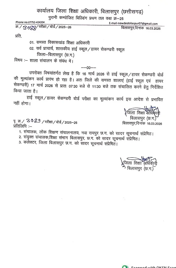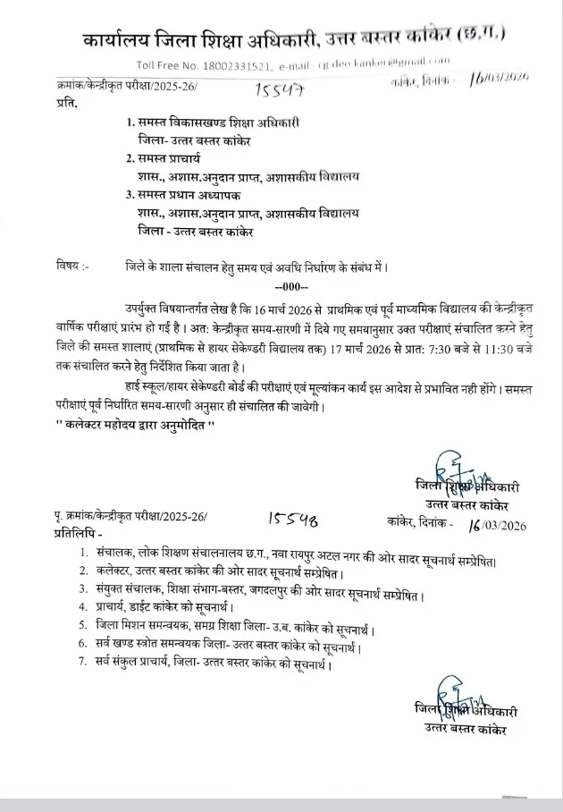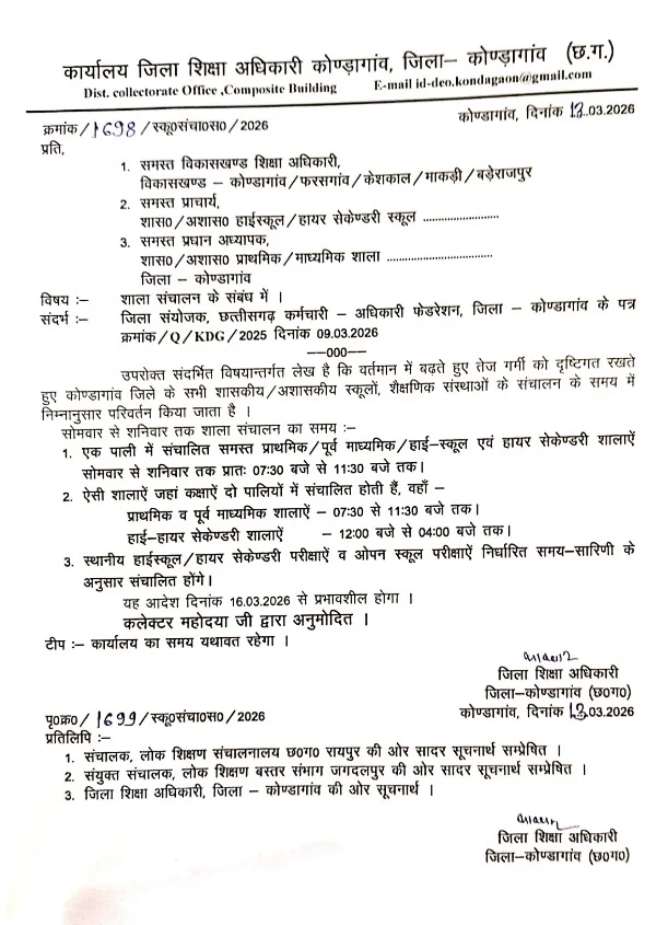 School Timing Change: छत्तीसगढ़ के कई जिलों में स्कूल के समय में बदलाव किया गया है। कहीं गरमी की वजह से स्कूल के समय में बदलाव किया गया है, तो कहीं परीक्षा या मूल्यांकन की वजह से स्कूल के समय में बदलाव किया गया है। कोंडागांव में आज भीषण गरमी की वजह से स्कूल के समय में बदलाव किया गया है। तो वहीं बिलासपुर में हाई स्कूल व हायर सेकेंडरी की मूल्यांकन की वजह से सभी हाई स्कूल व हायर सेकेंडरी कक्षाएं 7.30 बजे से 11.30 बजे तक संचालित की जायेगी। वहीं कांकेर में परीक्षा के संचालन को लेकर स्कूल के समय में बदलाव किया गया है। 17 मार्च से 7.30 बजे से 11.30 तक स्कूल का संचालन होगा। Post Views: 21 Please Share With Your Friends Also Post navigation IPS संतोष सिंह CISF में बनेंगे DIG : केंद्रीय प्रतिनियुक्ति पर जाएंगे संतोष सिंह, गृह मंत्रालय ने जारी किया आदेश… CAF जवान ने खुद को मारी गोली, कैंप में मचा हड़कंप