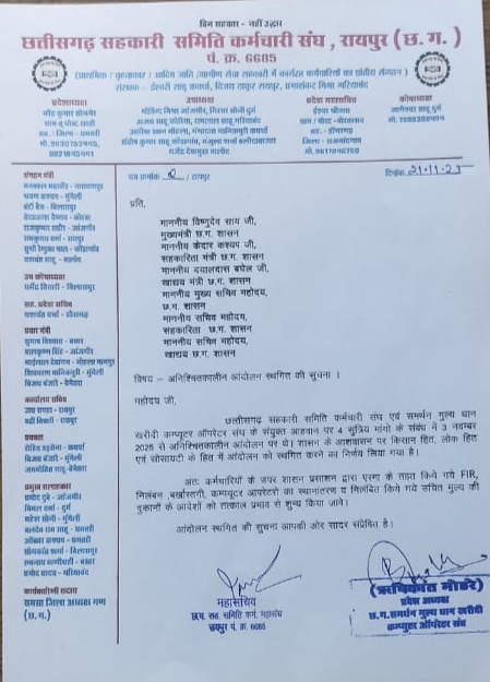 सहकारी समिति कर्मचारियों ने हड़ताल किया स्थगित 3 नवंबर से अनिश्चितकालीन हड़ताल पर बैठे थे सहकारी समिति के कर्मचारी अंबिकापुर। जिले में विगत माह से छत्तीसगढ़ सहकारी समिति कर्मचारी संघ एवं समर्थन मुल्य धान खरीदी कम्प्यूटर ऑपरेटर संघ के संयुक्त आहवान पर 4 सुत्रिय मांगो के संबंध में 3 नवम्बर 2025 से अनिश्चितकालीन आंदोलन पर थे। शासन के आश्वसन पर किसान हित, लोक हित एवं सोसायटी के हित में आंदोलन को स्थगित करने का निर्णय लिया गया है। अतः कर्मचारियों के उपर शासन प्रशासन द्वारा एस्मा के तहत किये गये FIR, निलंबन बर्खास्तगी कम्पयूटर आपरेटरों का स्थानांतरण निलंबित किये गये उचित मूल्य की दुकानों के आदेशों को तत्काल प्रभाव से शुन्य किया जावे। Post Views: 74 Please Share With Your Friends Also Post navigation चौपाटी नहीं हटाने को लेकर जमकर हंगामा! पूर्व विधायक विकास उपाध्याय समेत कई कांग्रेसी गिरफ्तार CG: छात्रावास में छात्राएं हुई अचानक बेहोश, अधीक्षिका ने बुलाया बैगा, कहा– भूत-प्रेत का साया