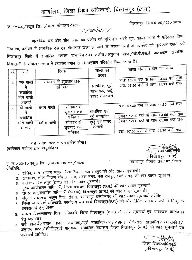 बिलासपुर। जिले के स्कूलों के समय में बदलाव किया गया है। इस संबंध में आदेश जारी कर दिया गया है। दरअसल ठंड की वजह से स्कूल के समय में बदलाव किया गया था। अब ठंड के खत्म होने के बाद स्कूल के समय को यथावत कर दिया गया है। एक पाली मं संचालित होने वाली शालाएं अब सोमवार से शुक्रवार तक सुबह 10 बजे से शाम चार बजे तक संचालित होगी। जबकि शनिवार को कक्षा सुबह 7.30 बजे से 11.30 बजे तक लगेगी। वहीं दो पालियों में संचालित होने वाली कक्षाएं पहली पाली में सोमवार से शुक्रवार तक सुबह 7.30 बजे से 11.30 बजे तक होगी, जबकि शनिवार को दोपहर 12 बजे से 4 बजे तक कक्षाएं संचालित होगी। वहीं दूसरी पाली में सोमवार से शुक्रवार तक दोपहर 12 बजे से शाम 5 बजे तक चलेगी, जबकि शनिवार को ये कक्षाएं सुबह 7.30 बजे से दोपहर 11.30 बजे तक चलेगी। Post Views: 23 Please Share With Your Friends Also Post navigation CG TRANSFER NEWS: बड़ा प्रशासनिक फेरबदल, तहसीलदार-नायब तहसीलदारों के तबादले CG News: धरना, प्रदर्शन, जुलूस पर लगा प्रतिबंध, जारी हुआ आदेश, सुबह 9 बजे से रात 9 बजे तक आदेश रहेगा लागू
