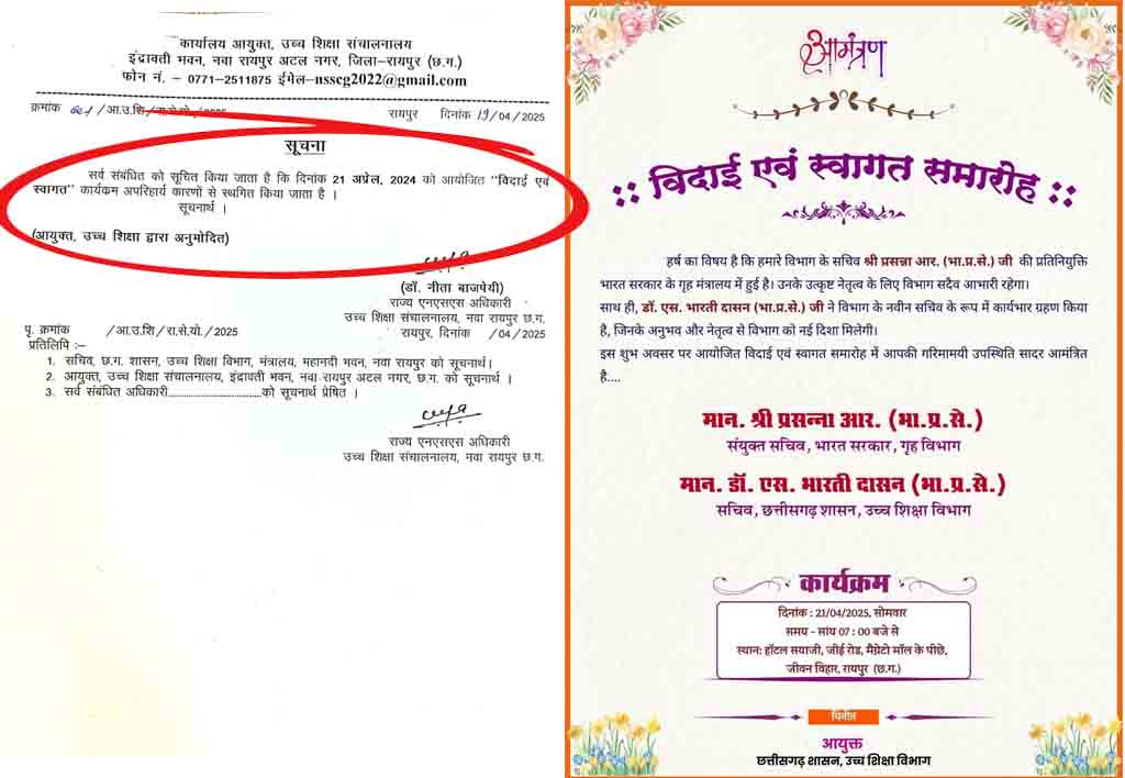 IAS Farewell Party : राजधानी के थ्री स्टार होटल में IAS अफसर की वेलकम और फेयरवेल पार्टी पर विवाद का ग्रहण ऐसा लगा कि कार्यक्रम ही रद्द करना पड़ गया। दरअसल पिछले 24 घंटे से सोशल मीडिया पर फेयरवेल और वेलकम पार्टी का एक कार्ड सोशल मीडिया में जमकर वायरल हो रहा था। IAS अफसरों की पार्टी के इस कार्ड को लेकर सरकारी खजाने की फिजुलखर्ची से जोड़ा जा रहा था। तो वहीं अफसरों की मनमानी को लेकर भी निशाना साधा जा रहा था। ट्वीटर और फेसबुक में आलोचनाओं की बौछार शुरू हो गयी। इधर, सोशल मीडिया में कार्ड वायरल हुआ, तो वहीं IAS के व्हाट्सएप ग्रुप में भी इस पर चर्चाएं शुरू हो गयी। आखिरकार दोपहर में प्रोग्राम के कैंसल होने का आफिशियल आर्डर जारी कर दिया गया। दरअसल आईएएस प्रसन्ना होम मिनिस्ट्री में संयुक्त सचिव बनाये गये हैं। वो केंद्रीय प्रतिनियुक्ति के लिए जाने वाले हैं। वहीं एस भारतीदासन को उच्च शिक्षा विभाग का सचिव बनाया गया है। एक अधिकारी के फेयरवेल और दूसरे के वेलकम पार्टी को लेकर 21 अप्रैल को होटल सायाजी में एक आयोजन होना था। अमूमन ऐसे कार्यक्रमों का कार्ड छपता नहीं है, लेकिन उच्च शिक्षा आयुक्त जेपी पाठक के दो कदम आगे बढ़ते हुए ना सिर्फ एक ग्रैंड पार्टी रख दी, बल्कि विधिवत कार्ड भी छपवा दिया। कार्ड वायरल हुआ तो बवाल मच गया। सोशल मीडिया पर अफसरों के मनमानी की कहानी शुरू हो गयी। विवाद बढ़ता देख कार्यक्रम को रद्द कर दिया गया है। Post Views: 219 Please Share With Your Friends Also Post navigation Live Suhagrat Video : भैया-भाभी की लाइव सुहागरात देखने कमरे में जा छिपा देवर, चीख पड़ी दुल्हन जब पड़ी नजर दूल्हे की हरकत से टूटा रिश्ता, बिना दुल्हन के लौटी बारात, पूरा मामला…