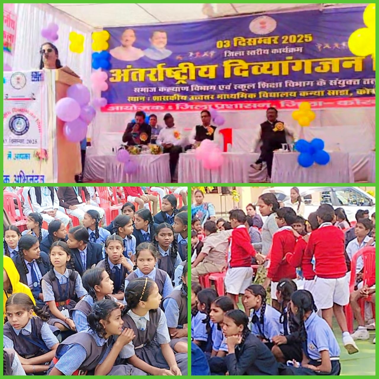 दिव्यांग दिवस पर संयुक्त पहल, डालसा, शिक्षा विभाग, समाज कल्याण और स्वयंसेवी संस्थाएं एक साथ कु० डिंपल कोरबा :- माननीय प्रधान जिला एवं सत्र न्यायाधीश/अध्यक्ष, जिला विधिक सेवा प्राधिकरण कोरबा के निर्देशानुसार अंतर्राष्ट्रीय दिव्यांग दिवस के अवसर पर जिला विधिक सेवा प्राधिकरण, शिक्षा विभाग, समाज कल्याण और स्वयंसेवी संस्थाओं के संयुक्त तत्वाधान में शासकीय कन्या हायर सेकेण्डरी विद्यालय साडा, जिला कोरबा में विधिक जागरूकता कार्यकम का आयोजन किया गया। इस अवसर पर सचिव कु. डिम्पल, जिला विधिक सेवा प्राधिकरण कोरबा ने दिव्यांग अधिकार अधिनियम 2016 के तहत अधिकारों को बढ़ावा देना एवं चुनौतियों के प्रति जागरूक करना तथा दिव्यांग बच्चों को शिक्षा रोजगार, सामाजिक सुरक्षा, आवागमन और न्याय तक समान अवसर, समान सम्मान, गैर भेद-भाव का पूर्ण कानूनी अधिकार के बारे में जागरूक किया साथ ही दिव्यांग छात्र/छात्राओं को उपहार में चित्रकला सामग्री वितरित कर उनके द्वारा बनाये गये चित्रकला का अवलोकन कर, एकता दौड़ को हरी झण्डी दिखाकर कार्यकम का शुभारंभ किया। रोहित राजवाड़े, चीफ, लीगल एड डिफेन्स कौंसिल ने अपने उद्बोधन में दिव्यांगजनों को बताया कि ईश्वर ने आपसे कुछ लिया है तो कुछ विशेष दिया भी है दिव्यांगता के साथ कुछ विशेष गुण उपलब्धियां दिया है जिससे आप श्रेष्ठता की शिखर तक पहुँचते है एवं डिप्टी चीफ नंदकिशोर पासवान ने प्रतियोगिता में सम्मिलित होने वाले बच्चे एवं अभिभावकों को इस दिवस को एक उत्सव के रूप में मनाये जाने की प्रेरणा दी।इस अवसर पर शिक्षा विभाग की ओर जिला शिक्षा अधिकारी, टी.पी. उपाध्याय ने अपने उदबोधन में बताया कि कल्पना कीजिए एक ऐसे बागीचे की जिसमें तरह-तरह के फूल खिलते हैं किसी का अपना रंग है तो किन्ही की अपना खुशबु, और वही विशेषता या योग्यता ही उसे सक्षम बनाती है। डी.एम.सी. मनोज पाण्डेय, उपसंचालक समाज कल्याण हरीश सक्सेना ने बताया कि समाज का सबसे ज्यादा शारीरिक आर्थिक राजनीतिक और संस्कृत रूप से पिछड़ तपका दिव्यांगों को समझ में अपनी जगह बनाने के लिए माहौल मिलना चाहिए जो प्रतिदिन चुनौतियों का सामना कर रहे हैं। समाज कल्याण दिव्यांगजनों के सहयोग में अनुकुल वातावरण तैयार करता है जिससे सामाजिक तथा आर्थिक दोनो स्तर पर व्यापक सकारात्मक परिवर्तन संभव होते हैं। देश में करोडो दिव्यांग विज्ञान तकनीकी, तथा उद्यमिता जैसे क्षेत्र में उल्लेखनीय योगदान दे रहे है। कार्यक्रम में मुकेश दिवाकर समाज कल्याण,जावेद अख्तर ब्लॉक कोऑर्डिनेटर समावेशी शिक्षा, अधिकारी/कर्मचारी एवं प्रमोद तिवारी सहायक लीगल कौसिल, पैरालीगन वालेटियर्स रमाकांत दुबे ,गोपाल चंद्रा त्रियुगीनारायण रजवाड़े तथा स्वयंसेवी संस्था उम