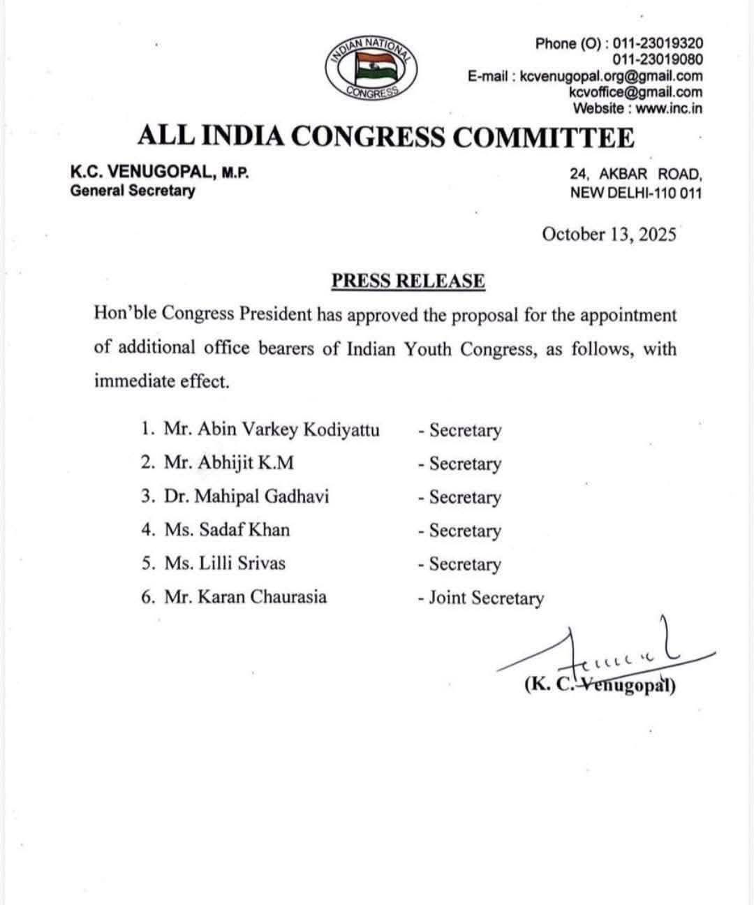 एआईसीसी ने पांच नेताओं को युकां का राष्ट्रीय सचिव नियुक्त किया है। इस सम्बन्ध में पार्टी के महासचिव केसी वेणुगोपाल ने आदेश जारी कर दिया है। इन नियुक्तियों में धमतरी जिले के कुरुद के जनपद सदस्य और कांग्रेस की युवा महिला नेता लिल्ली श्रीवास का भी नाम शामिल है, जिसपर राहुल गाँधी ने अपना भरोसा जताया है। देखें किन नेताओं को बनाया गया युकां का राष्ट्रीय सचिव-