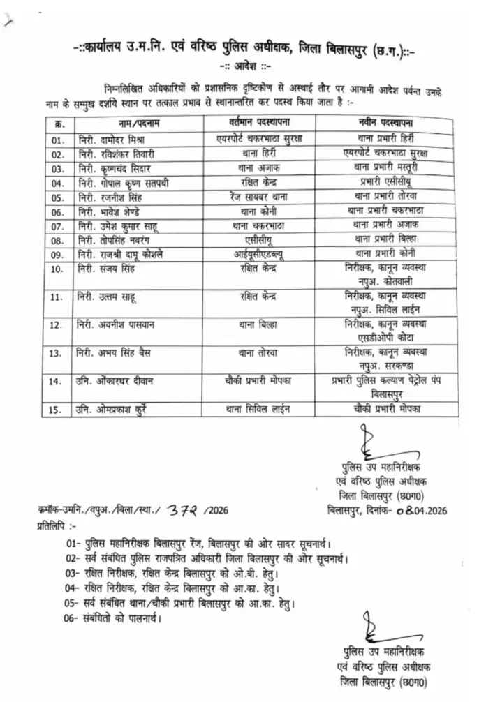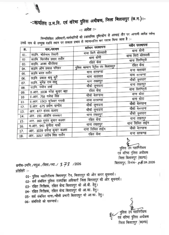Police Transfer: पुलिस विभाग ने प्रशासनिक व्यवस्था को मजबूत करने के उद्देश्य से थाना प्रभारियों के स्तर पर व्यापक बदलाव किए हैं। छत्तीसगढ़ के बिलासपुर जिले के पुलिस महकमे में एक साथ 33 पुलिसकर्मियों का तबादला कर दिया गया है। इनमें कई थानों के प्रभारी भी शामिल है। ये पुलिसकर्मी एक की थाने में लंबे समय से जमे हुए थे। SSP रजनेश सिंह ने ट्रांसफर के संबंध में आदेश जारी कर दिया है। Post Views: 17 Please Share With Your Friends Also Post navigation नर्सिंग कॉलेजों की फर्जी मान्यता पर गिरी गाज, रजिस्ट्रार हुई सस्पेंड ब्रेकिंग: राज्य सरकार ने 3 फीसदी महंगाई राहत की बढोत्तरी का किया ऐलान, 1 जनवरी से मिलेगा एरियर्स, देखिये आदेश..