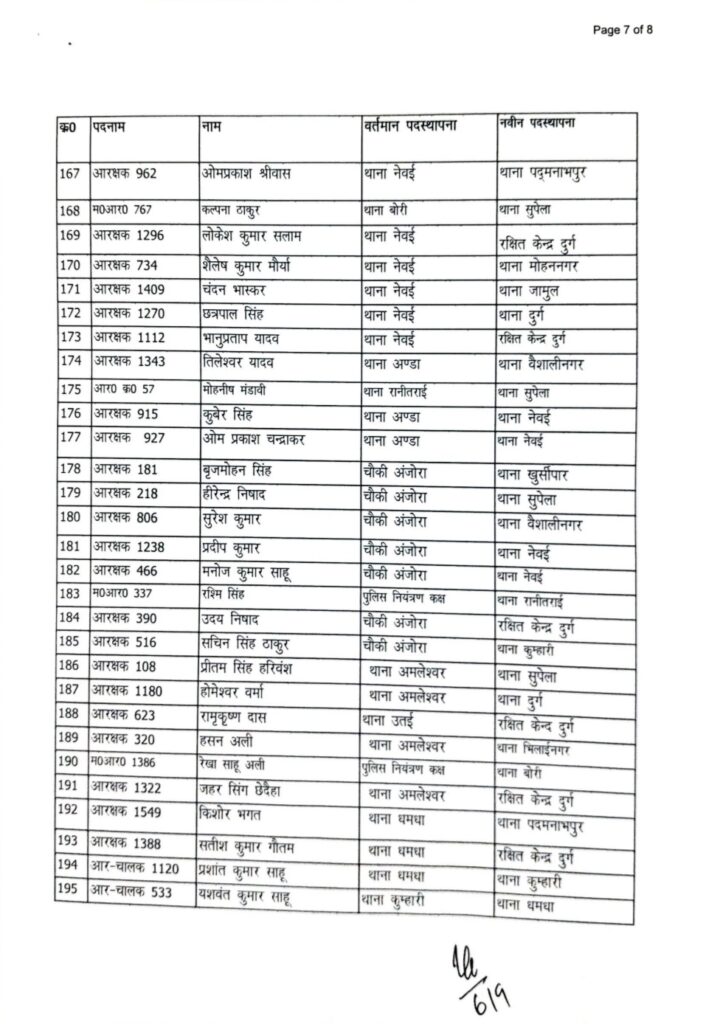 दुर्ग। छत्तीसगढ़ के दुर्ग जिले के पुलिस विभाग में बड़ा फेरबदल हुआ है। एसपी विजय अग्रवाल ने एक साथ 97 पुलिसकर्मियों का तबादला आदेश जारी किया हैं।