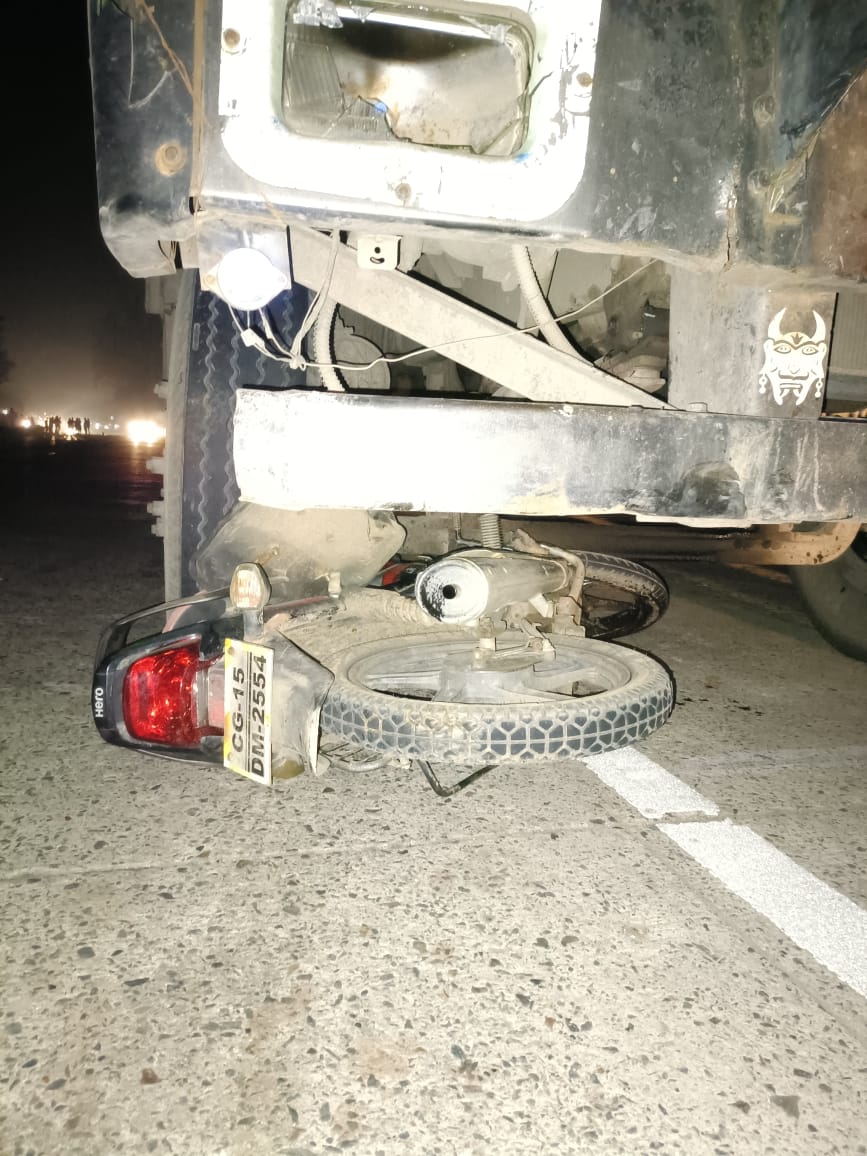 AMBIKAPUR / UDAIPUR / KKR एन.एच. 130 डांडगांव शिवमंदिर के समीप हुआ हादसा, ट्रक और बाईक में आमने सामने हुई भिडंत बाईक सवार युवक की घटनास्थल पर हुई दर्दनाक मौत ट्रक ड्रायवर ने थाने में किया सरेंडर उदयपुर – उदयपुर थाना क्षेत्र के ग्राम डांडगांव शिवमंदिर के समीप मंगलवार की रात 8.30 बजे ट्रक और बाईक में आमने सामने जबरदस्त भिडंत होने से बाईक ट्रक के सामने जा घुसा और बाईक सवार युवक की सर पर से बहुत सारा खून गिर जाने से मौके पर ही दर्दनाक मौत हो गई। आसपास के लोग जब तक कुछ समझ पाते तब तक ट्रक का चालक मौके पर वाहन को छोड़कर उदयपुर थाने में आकर सरेंडर कर दिया। प्राप्त जानकारी के अनुसार रायपुर की ओर से ट्रांसपोर्ट का माल लोड कर आ रहे ट्रक के चालक ने रात 8.30 बजे करीब लापरवाही पूर्वक वाहन चलाते हुये एन.एच. 130 के ग्राम डांडगांव शिवमंदिर के समीप उदयपुर से साल्ही जा रहे बाईक सवार को अपनी चपेट में ले लिया जिससे बाईक सवार युवक की मौके पर ही मौत हो गई है। बाईक ट्रक के नीचे फंसा रहा और सवार के सिर से घटनास्थल पर काफी खून बह जाने से सड़क पूरी लाल नजर आने लगी। घटना की सूचना पर उदयपुर थाना प्रभारी कुमारी चन्द्राकर दल बल सहित पहुंचकर ट्रक के नीचे फंसे वाहन को बाहर निकलवाया और मृतक के शव को सीएचसी उदयपुर के मरचुरी के लिए रवाना किया दुर्घटनाकारित ट्रक को पुलिस द्वारा थाना लाया जा रहा है। इस कार्यवाही में उप निरीक्षक आभाष मिंज, आरक्षक देवेन्द्र सिंह, विरेन्द्र और 112 के स्टॉफ रत्नेश सक्रिय रहे। उदयपुर थाना क्षेत्र में NH 130 पर यह आज दूसरी सड़क दुर्घटना है Post Views: 1,240 Please Share With Your Friends Also Post navigation नाबालिग युवक 30 फीट गहरी खाई में गिरे, NH १३० पर अंधार झोरखा डांडगांव में हुई बाइक दुर्घटना 07 नग साल चिरान लोड वाहन को वन विभाग ने किया जप्त, वन अमला की कार्यवाही से लकड़ी तस्करों में हड़कंप