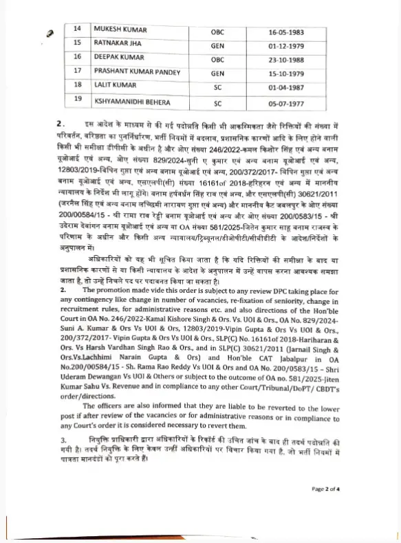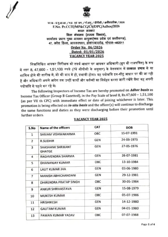 रायपुर:- रायपुर में आयकर विभाग से जुड़ी बड़ी प्रशासनिक खबर सामने आई है। देशभर में इनकम टैक्स विभाग ने बड़े पैमाने पर अधिकारियों को पदोन्नति दी है। इस क्रम में मध्यप्रदेश-छत्तीसगढ़ (MP-CG) सर्किल के 19 इनकम टैक्स इंस्पेक्टरों को आयकर अधिकारी (ITO) के पद पर प्रमोट किया गया है।इसके साथ ही MP-CG सर्किल के 4 सहायक आयुक्तों को भी पदोन्नति मिली है। विभागीय स्तर पर जारी आदेश के बाद संबंधित अधिकारियों में उत्साह देखा जा रहा है।