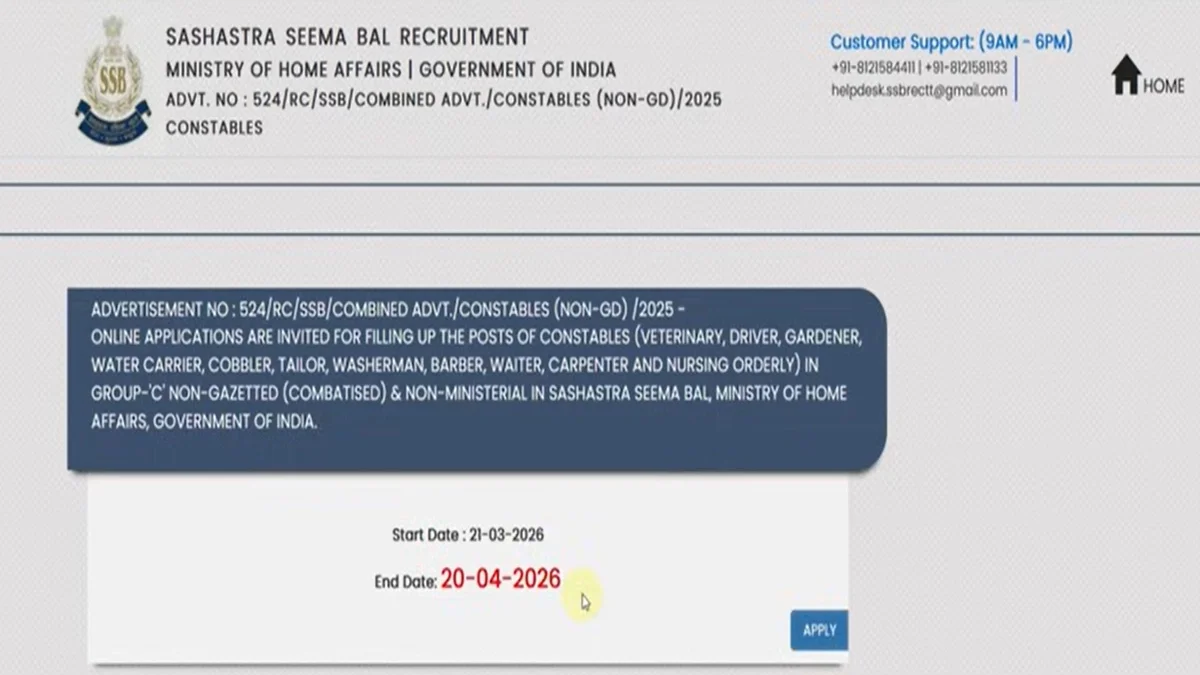 नई दिल्ली। सशस्त्र सीमा बल (SSB) ने रक्षा क्षेत्र में करियर बनाने के इच्छुक युवाओं के लिए सब-इंस्पेक्टर (SI) और असिस्टेंट सब-इंस्पेक्टर (ASI) के विभिन्न पदों पर भर्ती का आधिकारिक नोटिफिकेशन जारी कर दिया है। आवेदन की प्रक्रिया शुरू हो चुकी है और उम्मीदवार 20 अप्रैल 2026 तक ऑनलाइन फॉर्म भर सकते हैं। इस भर्ती अभियान के जरिए कुल 58 रिक्त पदों को भरा जाएगा, जिसमें तकनीकी और चिकित्सा विंग के पद शामिल हैं। भर्ती विवरण: किन पदों पर कितनी रिक्तियां? जारी अधिसूचना के अनुसार, इस भर्ती को मुख्य रूप से दो श्रेणियों में बांटा गया है। जहाँ सब-इंस्पेक्टर के लिए 51 पद निर्धारित हैं, वहीं असिस्टेंट सब-इंस्पेक्टर के लिए 7 पद आरक्षित किए गए हैं। पदों का विस्तृत विवरण नीचे दिया गया है: सब-इंस्पेक्टर (SI): स्टाफ नर्स (10), पायनियर (21), और कम्युनिकेशन (20)। असिस्टेंट सब-इंस्पेक्टर (ASI): फार्मासिस्ट (2), रेडियोग्राफर (1), ऑपरेशन थिएटर टेक्नीशियन (1), और डेंटल टेक्नीशियन (1)। पात्रता और आयु सीमा: कौन कर सकता है आवेदन? इन पदों के लिए शैक्षणिक योग्यता पदानुसार अलग-अलग रखी गई है। एसआई (स्टाफ नर्स) के लिए अभ्यर्थी का 12वीं पास होने के साथ जनरल नर्सिंग एंड मिडवाइफरी (GNM) में डिप्लोमा होना अनिवार्य है। वहीं, एसआई (पायनियर और कम्युनिकेशन) के लिए संबंधित क्षेत्र में इंजीनियरिंग डिग्री की मांग की गई है। एएसआई पदों के लिए उम्मीदवारों के पास 12वीं (विज्ञान) के साथ संबंधित मेडिकल ट्रेड में डिप्लोमा होना आवश्यक है। सभी पदों के लिए न्यूनतम आयु 18 वर्ष और अधिकतम 30 वर्ष तय की गई है। सरकारी नियमों के अनुसार, एससी, एसटी और ओबीसी वर्ग के उम्मीदवारों को ऊपरी आयु सीमा में नियमानुसार छूट प्रदान की जाएगी। Post Views: 17 Please Share With Your Friends Also Post navigation UPSC CSE 2026: जल्द जारी होगा सिविल सेवा परीक्षा का नोटिफिकेशन, जानें चयन प्रक्रिया और आवेदन के स्टेप्स