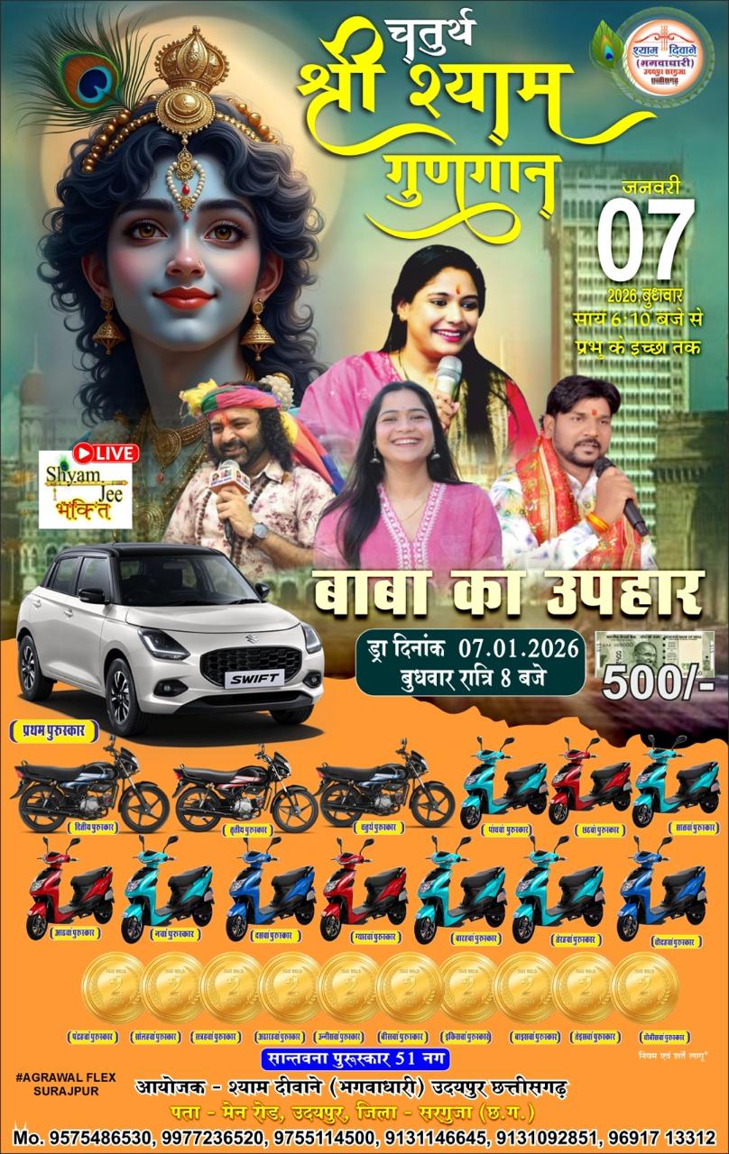 भव्य चतुर्थ श्री श्याम गुणगान का होगा आयोजन उदयपुर:- छत्तीसगढ़ 📅 तिथि: 07 जनवरी 2026 (बुधवार) शाम 6 बजे उदयपुर ...