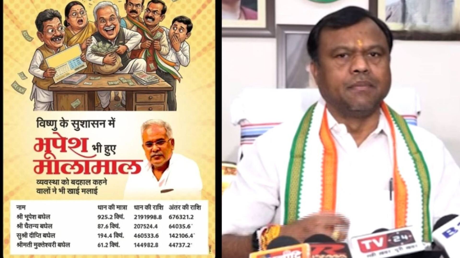 रायपुर। छत्तीसगढ़ में धान की मिठास पर सियासत की कड़वाहट हावी हो गई है। भाजपा ने एक पोस्टर जारी कर पूर्व मुख्यमंत्री भूपेश बघेल और उनके परिवार को मिले भुगतान को सार्वजनिक किया, जिसके बाद कांग्रेस ने मोर्चा खोल दिया है। दीपक बैज के एक सवाल ने भाजपा के भीतर भी हलचल मचा दी है- क्या भाजपा के नेता धान नहीं बेचते? भाजपा ने सोशल मीडिया में पोस्टर किया जारी। पोस्टर में EX CM भूपेश बघेल और परिवार के सदस्यों को धान खरीदी में हुए भुगतान को दर्शाया गया जिसे लेकर पीसीसी चीफ दीपक बैज ने कहा- इससे ज़्यादा स्तरहीन क्या हो सकता है हमारे नेता अगर किसान हैं धान की फसल कर रहे हैं तो जाहिर से बात हैं धान बेचेंगे क्या भाजपा ने खैरात में उन्हें भुगतान किया हैं जो पोस्टर जारी कर रहे हैं। ये मेहनत की कमाई हैं। क्या सिर्फ कांग्रेस के नेताओं ने धान बेचा हैं? भाजपा नेता ने धान नहीं बेचा क्या ? भाजपा के बड़े नेताओं का भी लिस्ट जारी की जाएँ किसने कितना धान बेचा? Post Views: 21 Please Share With Your Friends Also Post navigation कार की बैक लाइट और दरवाजों में छिपा था मौत का सामान: देख पुलिस भी रह गई दंग, 17 लाख का माल जब्त सरगुजा से होगा कांग्रेस का राज्यसभा सांसद उम्मीदवार? नामांकन से दो दिन पहले आई बड़ी जानकारी, सिंहदेव के गढ़ से किसका नाम