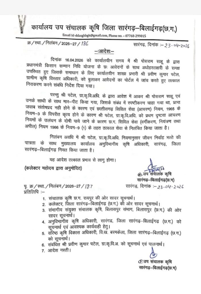 कलेक्टर के सख्त तेवर… दोषी अधिकारी पर गिरी गाज, मचा हड़कंप! नरेश चौहान, सारंगढ़ / सारंगढ़-बिलाईगढ़। जिले में पत्रकार पोश राम साहू के साथ मारपीट करने वाले कृषि विभाग के अधिकारी पर आखिरकार प्रशासन का डंडा चल गया है। लंबे समय से चर्चा में रहे इस मामले में अब बड़ी कार्रवाई सामने आई है। बताया जा रहा है कि जिला कलेक्टर संजय कन्नौजे ने पूरे मामले को गंभीरता से लेते हुए तत्काल संज्ञान लिया और जांच के बाद दोषी पाए गए अधिकारी पर कड़ी कार्रवाई के निर्देश दिए। कलेक्टर के निर्देश पर उप संचालक कृषि विभाग (DDA) ने प्रवीण पटेल, ग्रामीण कृषि विस्तार अधिकारी (REO) को निलंबित कर दिया है। गौरतलब है कि कुछ दिन पहले जिला कृषि कार्यालय में पत्रकार पोश राम साहू किसान सम्मान निधि एक किसान को नहीं मिलने पर चर्चा करने पहुंचे थे, जहां ग्रामीण क़ृषि विस्तार अधिकारी प्रवीण पटेल ने अचानक भड़क कर पत्रकार के साथ मारपीट कर दिया जिससे घटना के बाद पत्रकारों, सामाजिक संगठनों और आम लोगों में भारी आक्रोश देखने को मिला था। लगातार कार्रवाई की मांग उठ रही थी। जिससे आज अखिल भारतीय पत्रकार सुरक्षा समिति के सदस्यों ने एसपी और कलेक्टर से मुलाक़ात कर दोषी के ऊपर कार्यवाही करने किया था निवेदन आखिरकार प्रशासन ने सख्ती दिखाते हुए यह संदेश दे दिया है कि किसी भी पत्रकार, आम नागरिक या फरियादी के साथ दुर्व्यवहार बर्दाश्त नहीं किया जाएगा। इस कार्रवाई के बाद जिले के प्रशासनिक महकमे में हड़कंप मच गया है। वहीं पत्रकार जगत में इस निर्णय को न्याय की जीत माना जा रहा है।अब सवाल यह है कि क्या आगे और भी जिम्मेदार लोगों पर कार्रवाई होगी…? फिलहाल जिलेभर में इसी कार्रवाई की चर्चा जोरों पर है।“कलम की आवाज दबाने वालों को मिला करारा जवाब!”“पत्रकार सम्मान पर हमला… प्रशासन का सीधा प्रहार!” Post Views: 5 Please Share With Your Friends Also Post navigation मेहनत का जादू: टिंकल चौहान ने 95.42% के साथ टॉप-10 में बनाई जगह