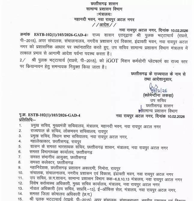रायपुर। छत्तीसगढ़ प्रदेश में सरकारी कर्मचारियों के तबादले का दौर जारी है। इसी कड़ी में नगरीय प्रशासन एवं विकास विभाग में बतौर अपर संचालक पदस्थ रहें पुलक भट्टाचार्य का तबादला सामान्य प्रशासन विभाग में कर दिया गया है। इस संबंध में आदेश भी जारी कर दिया गया है। मिली नई जिम्मेदारी पुलक भट्टाचार्य सरकार ने बड़ी जिम्मेदारी सौंपी है। उन्हें उन्हें केंद्र सरकार की महत्वाकांक्षी योजना iGOT मिशन कर्मयोगी प्लेटफॉर्म के राज्य स्तरीय क्रियान्वयन का समन्वयक भी बनाया गया है। क्या लिखा है आदेश में? इस संबंध में जारी आदेश में कहा गया है कि, “राज्य शासन एतद्द्वारा श्री पुलक भट्टाचार्य (राप्रसे, पी-2015), अपर संचालक, संचालनालय, नगरीय प्रशासन एवं विकास, इंद्रावती भवन, नवा रायपुर अटल नगर को प्रशासनिक आधार पर स्थानांतरित करते हुए, उप सचिव सामान्य प्रशासन विभाग मंत्रालय में तत्काल प्रभाव से आगामी आदेश पर्यन्त पदस्थ करता है। (Chhattisgarh Latest Transfer Order) पुलक भट्टाचार्य (राप्रसे, पी-2015) को iGOT मिशन कर्मयोगी प्लेटफॉर्म का राज्य स्तर पर क्रियान्वयन हेतु समन्वयक नियुक्त किया जाता है।” Post Views: 20 Please Share With Your Friends Also Post navigation CG में निर्माण कार्यों के चलते 26 ट्रेनें रद्द : 14-15 फरवरी और 4-26 अप्रैल तक एक्सप्रेस और मेमू ट्रेनें प्रभावित…. तुझसे नाराज़ नहीं जिंदगी…’ बेरहम बॉयफ्रेंड ने की लिव-इन पार्टनर की दर्दनाक हत्या! फिर लाश पकड़कर करता रहा ये काम! सलमा मर्डर केस में सबसे बड़ा खुलासा