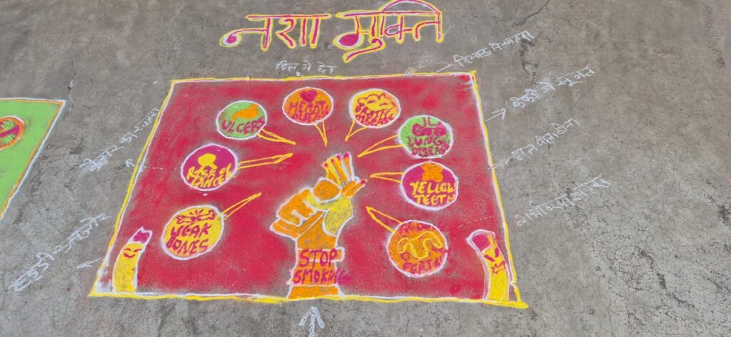 नशा मुक्ति अभियान के तहत जिला जेल कोरबा व उपजेल कटघोरा में रंगोली के माध्यम से नशे से होने वाले दुष्प्रभावों के संबंध में दिया गया संदेश -‘’ नशा भविष्य का नाश करता है, सभी परिवार और समाज का सर्वनाश करता है, ‘’