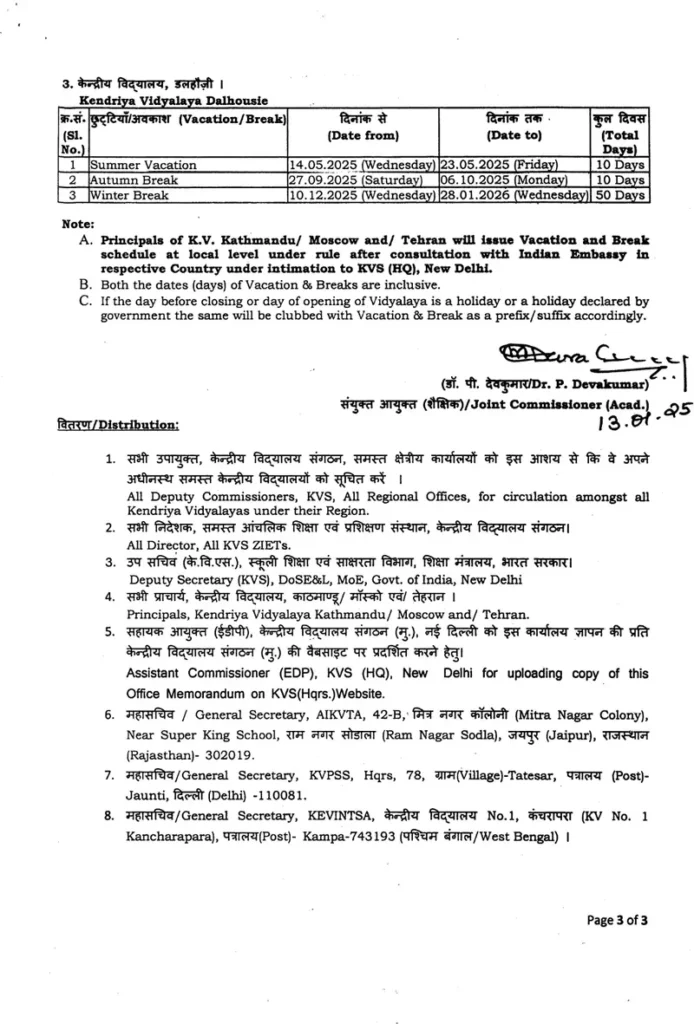 स्कूलों में कल से शीतकालीन अवकाश, कड़ाके की ठंड को देखते हुए इतने दिन तक बंद रहेंगे सभी स्कूल, निर्देश जारी नई दिल्ली :- दिवाली की छुट्टियां खत्म होने के बाद अब स्कूल-कॉलेज सहित सभी शैक्षणिक संस्थाएं खुल चुकी है और बच्चे स्कूलों में लौट चुके हैं। दिवाली के बाद से कई स्कूलों में अर्धवार्षिक परीक्षाएं भी शुरू हो चुकी है। वैसे तो अधिकतर स्कूलों में इन दिनों तेजी से कोर्स कम्पलीट करवाने की कोशिश की जा रही है, ताकि बोर्ड परीक्षाएं शुरू होने से पहले ही स्टूडेंट्स को एक बार रिविजन कराया जा सके। दूसरी ओर स्कूलों में शीतकालीन छुट्टी के लिए नोटिफिकेशन जारी कर दिया गया है। किन शहरों में कब से रहेंगे स्कूल बंद?. मिली जानकारी के अनुसार केंद्रीय विद्यालय समिति ने सभी स्कूलों में शीतकालीन अवकाश की छुट्टी के लिए नोटिफिकेशन जारी कर दिया है। जारी निर्देश के अनुसार अत्यधिक गर्मी वाले स्थान आगरा, जबलपुर, चंडीगढ़, देहरादून, दिल्ली, गुरुग्राम, जम्मू, कोलकाता, लखनऊ, पटना, रांची, गुवाहाटी, सिल्चर, तिनसुकिया व वाराणसी में 20 दिनों तक शीतकालीन अवकाश रहेगी। जबकि जयपुर, अहमदाबाद, बेंगलुरु, चेन्नई (के.वि. माहे को छोड़कर), हैदराबाद, मुंबई, रायपुर, भुवनेश्वर एवं भोपाल में बच्चों को 10 दिन का शीतकालीन अवकाश दिया जाएगा। वहीं, इस दिशा निर्देश में अत्यधिक ठंडी वाले स्थान जैसे लद्दाख, देहरादून के स्कूलों के लिए 40 से 50 दिन का शीतकालीन अवकाश तय किया गया है। यहां शीतकालीन अवकाश 4 दिसंबर से शुरू होंगे और 22 दिसंबर तक स्कूल बंद रहेंगे। इस संबंध में केंद्रीय विद्यालय प्रबंधन की ओर से नोटिफिकेशन जारी कर दिया गया है। Post Views: 396 Please Share With Your Friends Also Post navigation आपके कमरे में नहीं आ पाएगा मकान मालिक, किराएदारों के लिए लागू हुए ये नया नियम पान मसाला के शौकीनों के लिए बड़ी खबर, सरकार ने जारी किया ये आदेश